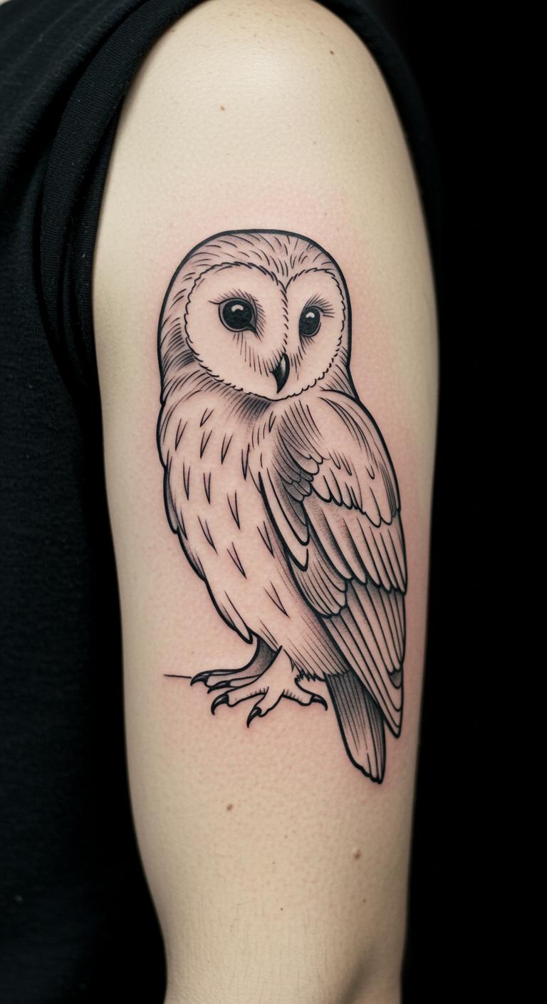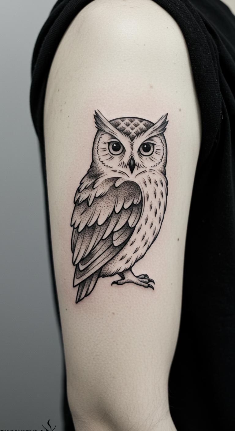 Thick lines make your owl bold. Bicep spot shows strength. Bold strokes stand out. Draw thick lines at home. Use bold markers. Choose a fair artist. Thick ink is straightforward. Size for impact. Use basic care. This design empowers you. Add thickness from practice. It’s strong and clear.