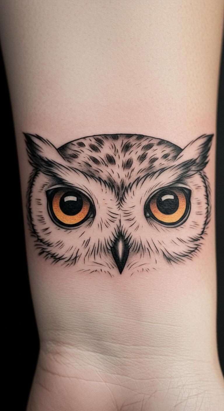 Focus on just the owl’s eyes for a piercing effect. Wear it on your wrist for constant visibility. This design uses minimal lines to convey watchfulness. Sketch eyes on paper with a marker for practice. Search free apps for eye templates. Go to a budget-friendly studio for this quick job. Black ink keeps it simple and cheap. Make it small to reduce costs. Heal with over-the-counter cream. Let it remind you to stay alert. Personalize by shading one eye differently in your design. It’s easy to show off or cover.