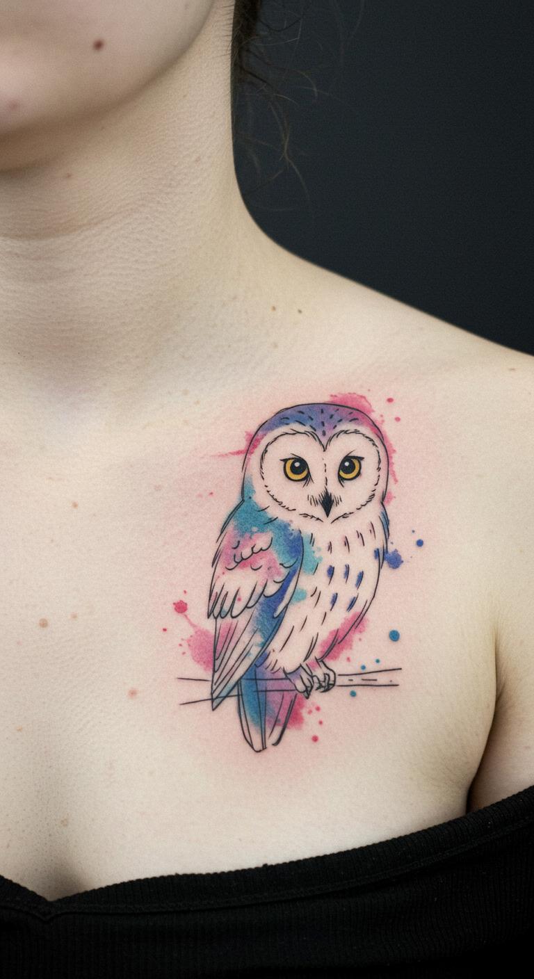 Try a watercolor owl with soft, blended edges for a dreamy look. Place it on your collarbone for elegance. It mimics paint strokes with few colors. Practice with watercolors at home on paper. Find tutorials online at no cost. Select an artist who offers watercolor at a fair price. Use one or two colors to stay economical. Keep the size small for affordability. Maintain it with gentle, store-bought products. This design evokes imagination in your day. Add a splash of color based on your sketch. It’s light and airy, perfect for summer wear.