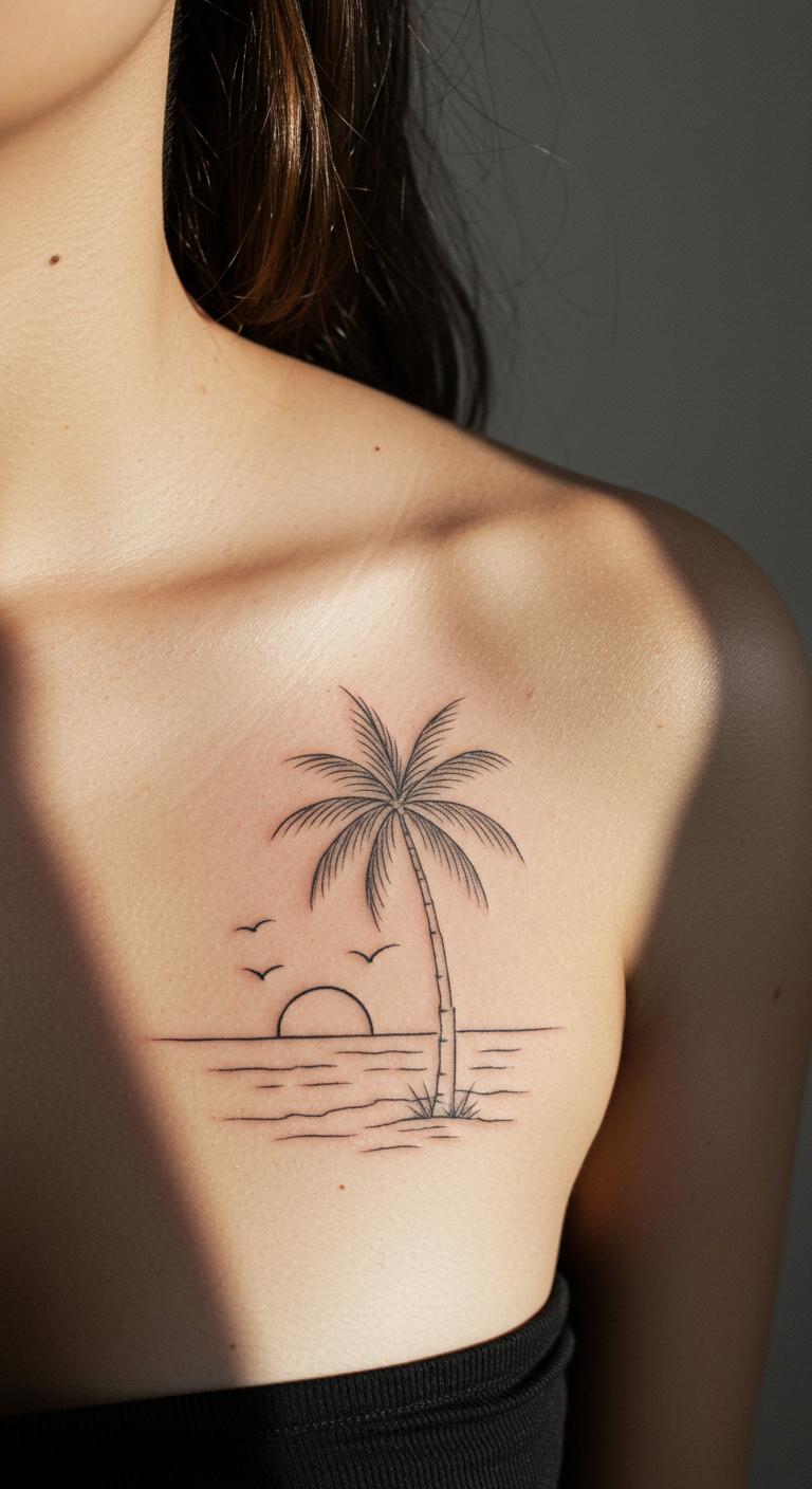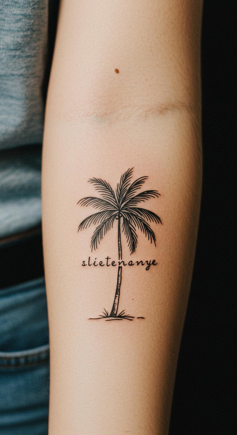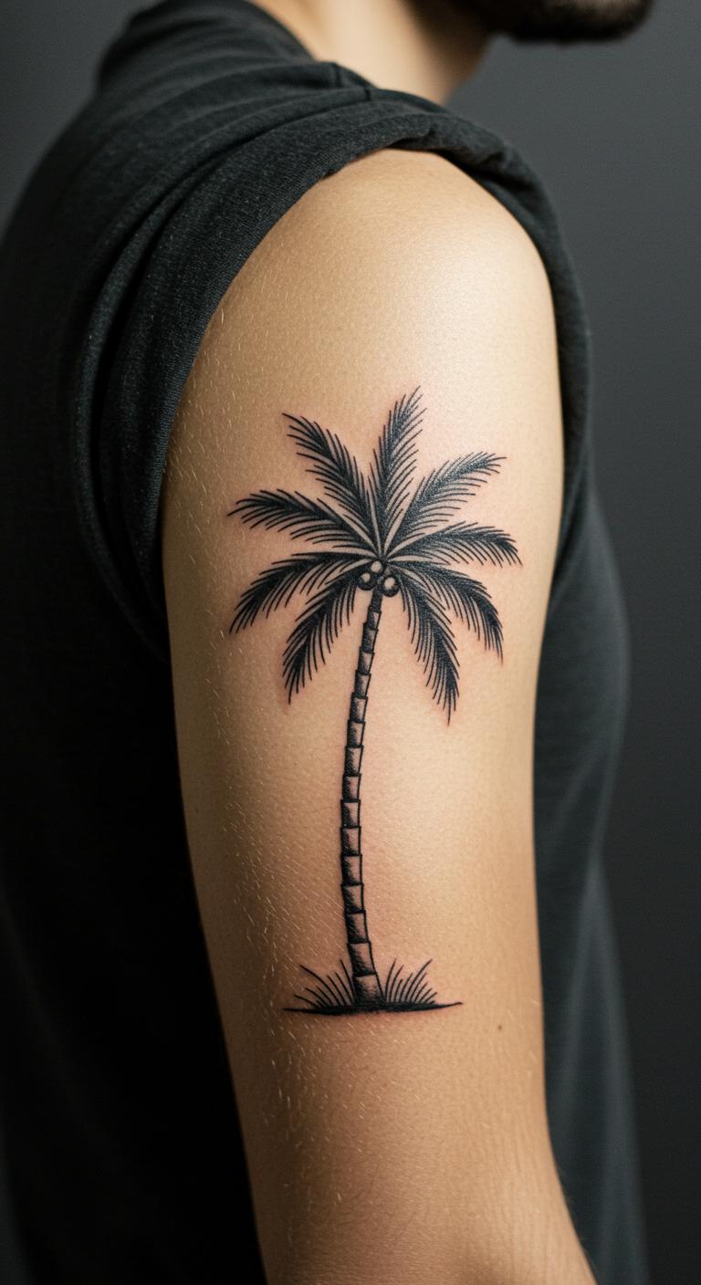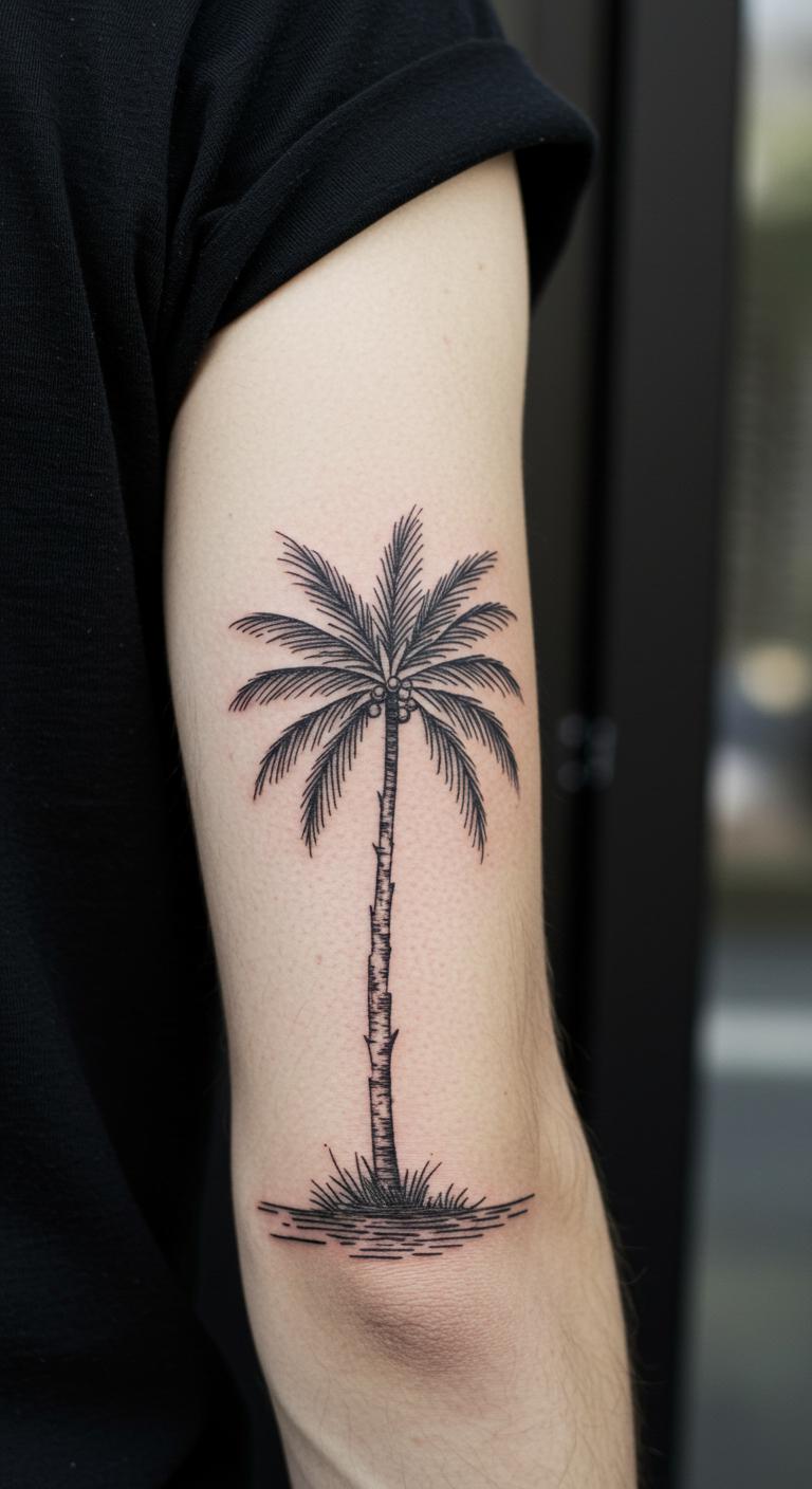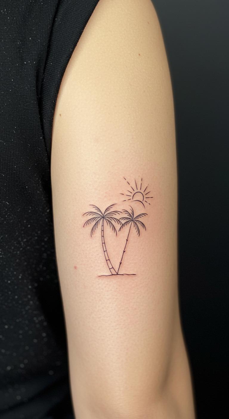 A simple palm tree outline keeps things straightforward and elegant. Picture a single tree sketched in thin black lines on your skin. This design fits small spots like the wrist or ankle, making it ideal for a first tattoo. Start with a local artist who uses basic tools—costs around $50 to $100. For a DIY feel, sketch the outline on paper first to test placement. Use free apps to draw your version at home. Add a personal twist by choosing ink colors from affordable sets online. Keep sessions short to ease any discomfort. This style ages well and needs little upkeep. Go for spots that heal fast, like the forearm. Pair it with daily sunscreen to protect the ink. Try drawing it with a marker on your body before deciding. You’ll love how it adds a touch of calm to your routine.