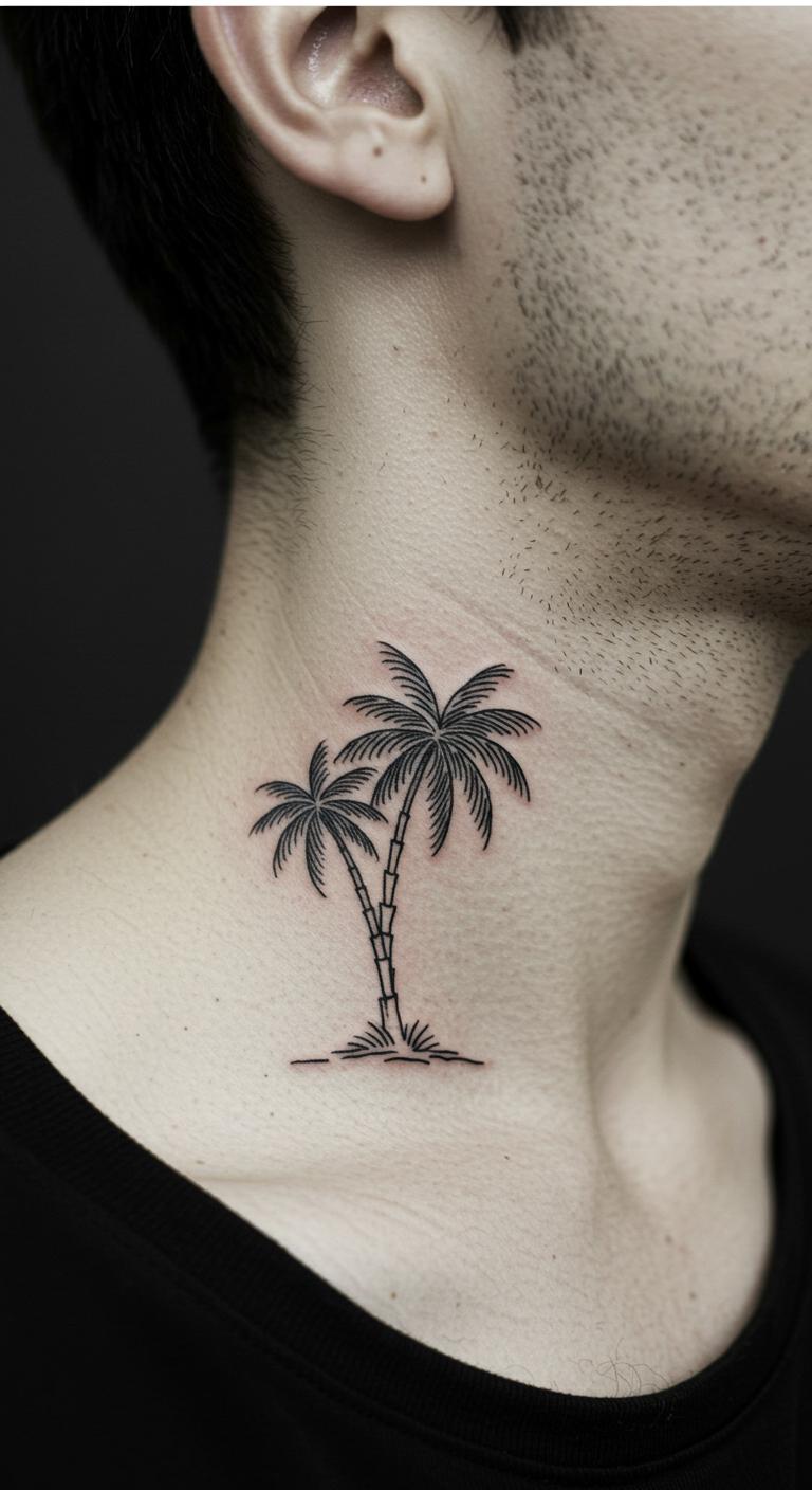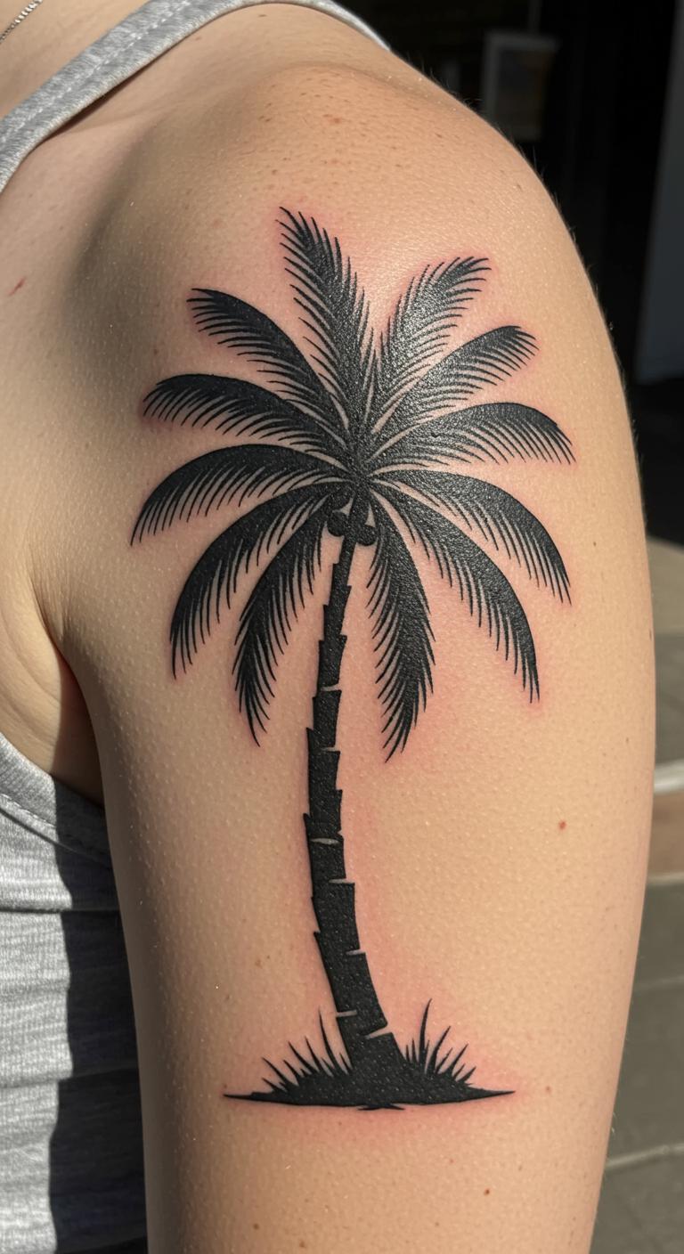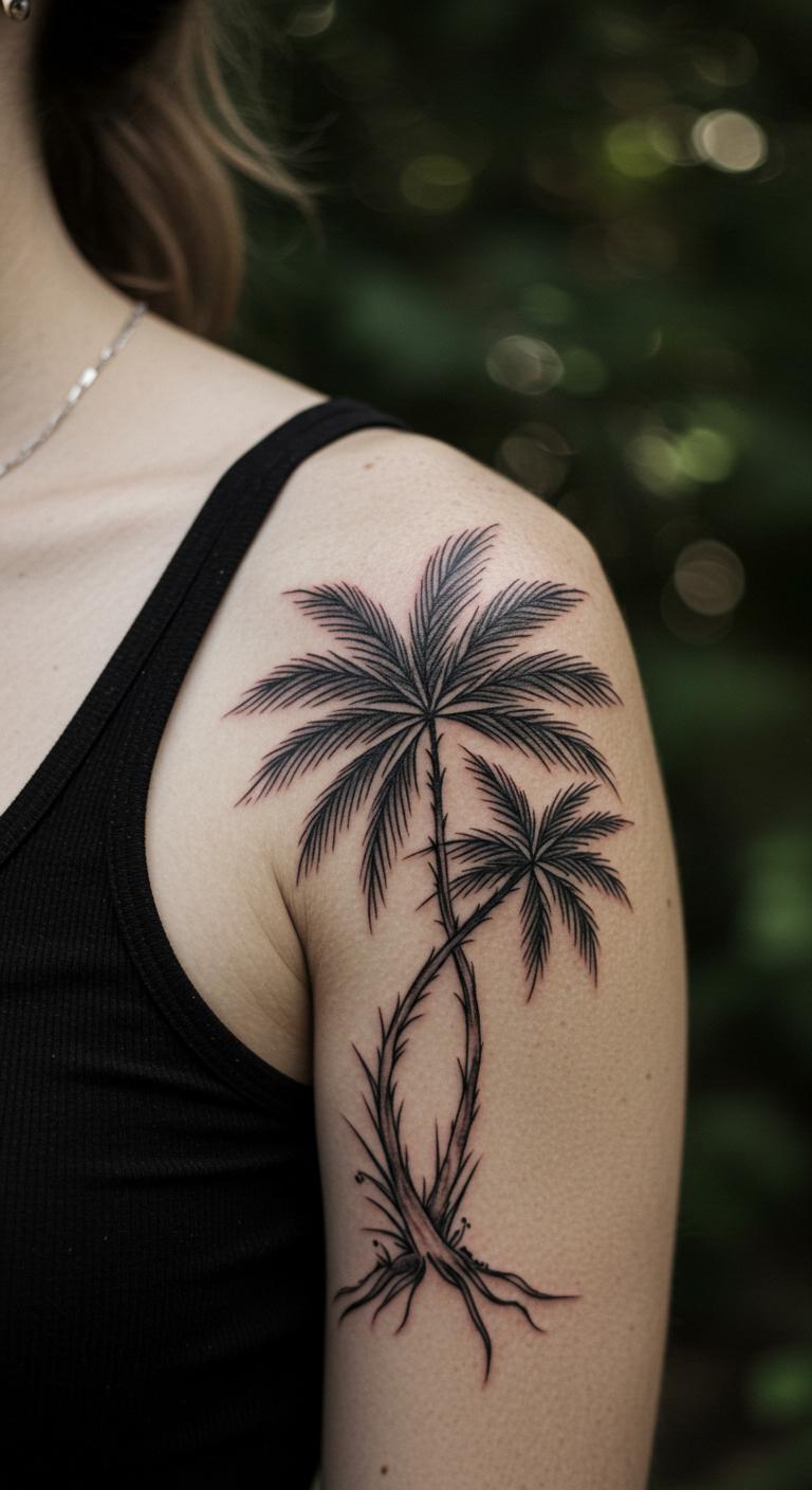 Blackwork palm trees use solid black for a striking effect. Bold shades make the tree pop on spots like the shoulder. It’s easy to cover if needed, costing about $70 at a walk-in shop. Draw bold outlines at home with thick markers for practice. Layer in simple patterns using free drawing tools. Pick spots that stay hidden under clothes. Use aloe vera from your kitchen for aftercare. Add a trunk detail with household items like tape for mock-ups. This style holds up over time. Go for sessions that last 30 minutes. Pair it with other black designs for balance. You’ll appreciate the strong, simple statement it makes.