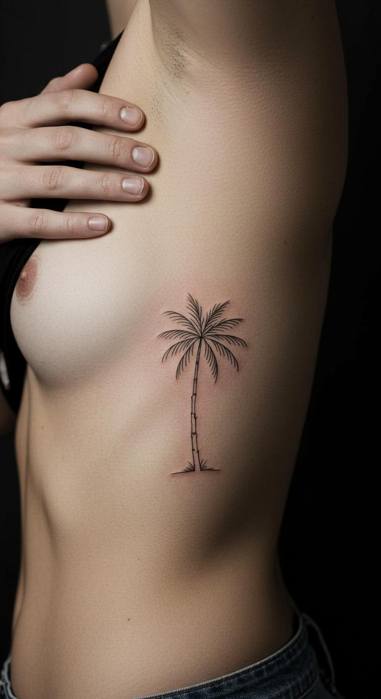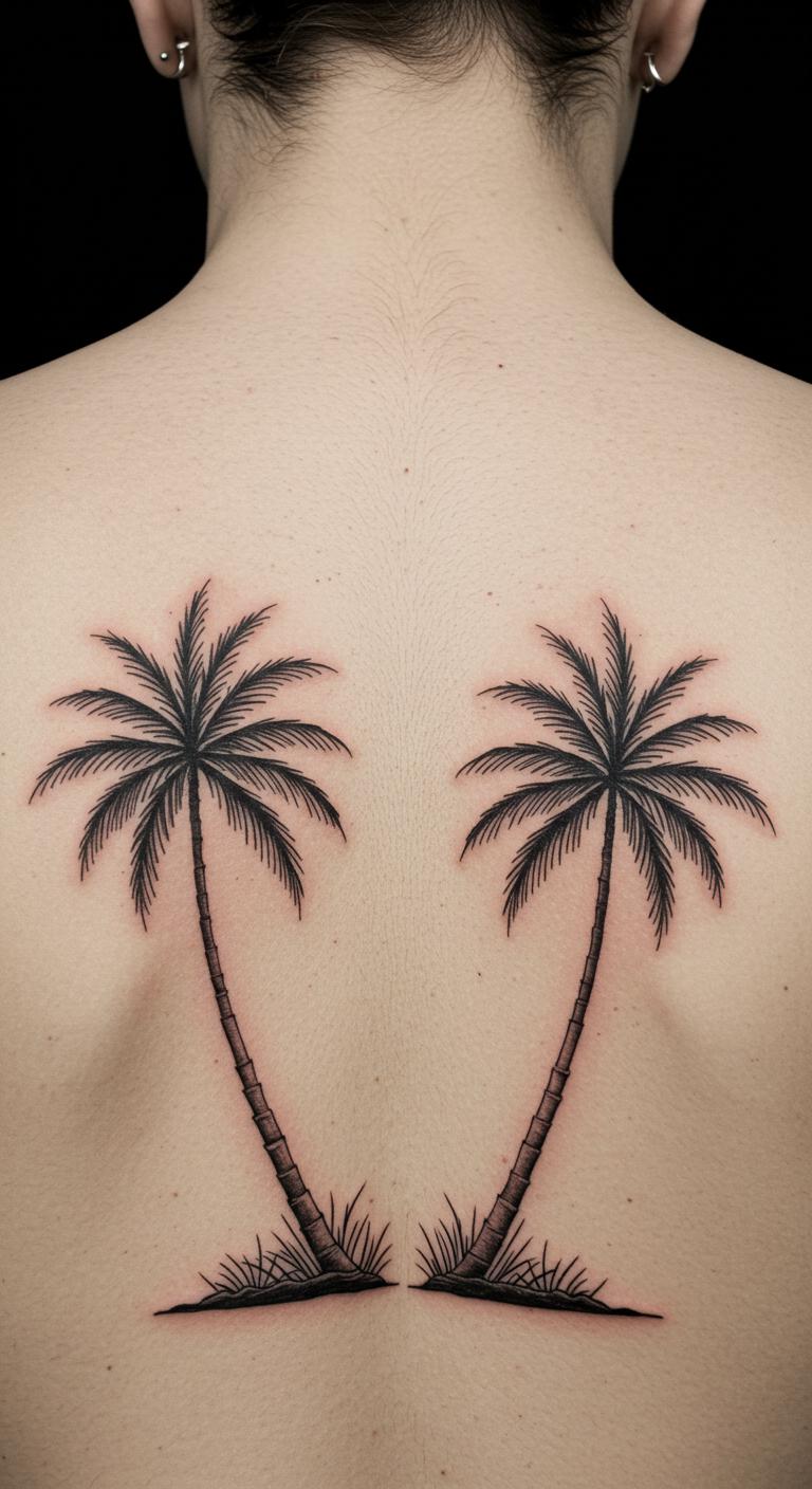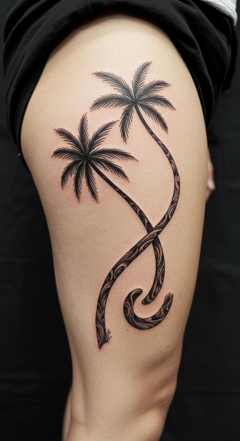 Blackwork palm trees use solid black for a striking effect. Bold shades make the tree pop on spots like the shoulder. It’s easy to cover if needed, costing about $70 at a walk-in shop. Draw bold outlines at home with thick markers for practice. Layer in simple patterns using free drawing tools. Pick spots that stay hidden under clothes. Use aloe vera from your kitchen for aftercare. Add a trunk detail with household items like tape for mock-ups. This style holds up over time. Go for sessions that last 30 minutes. Pair it with other black designs for balance. You’ll appreciate the strong, simple statement it makes.
