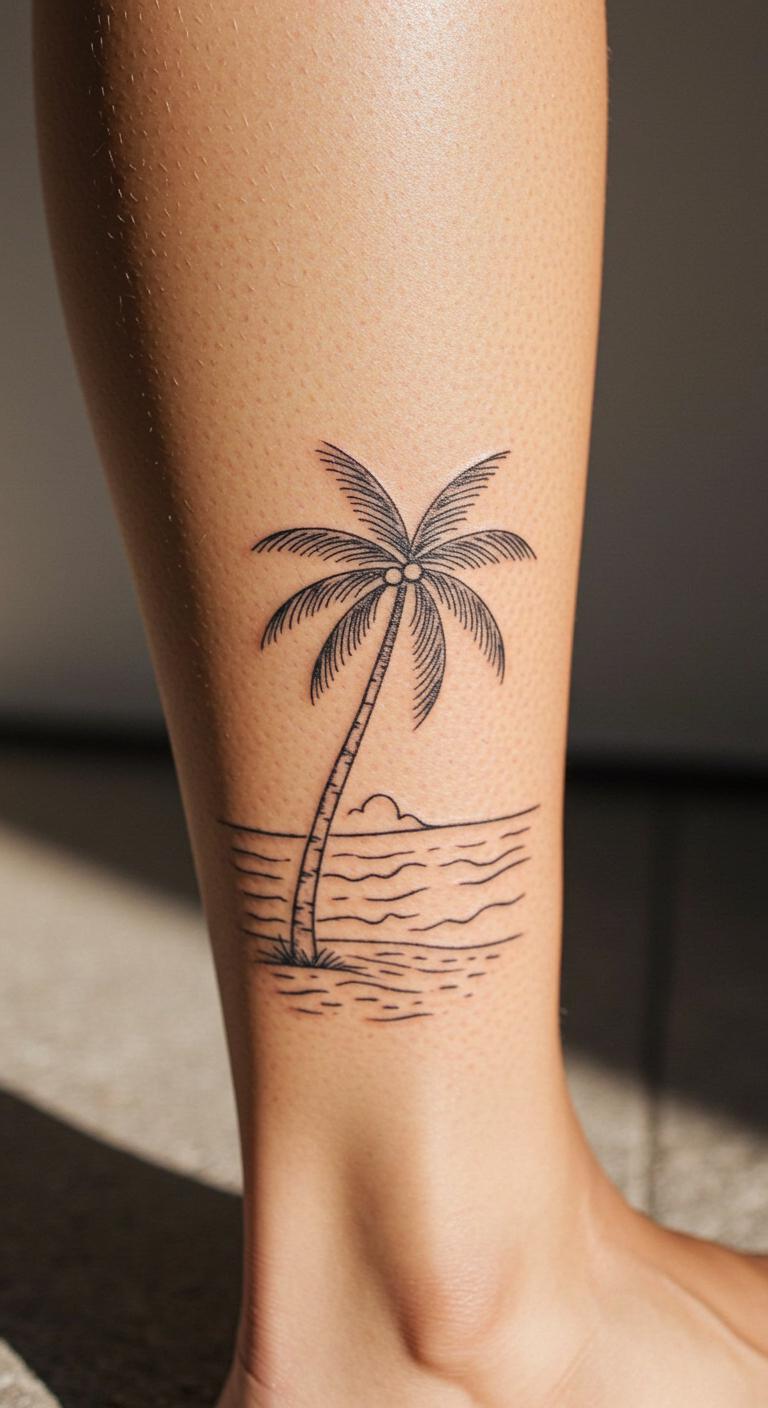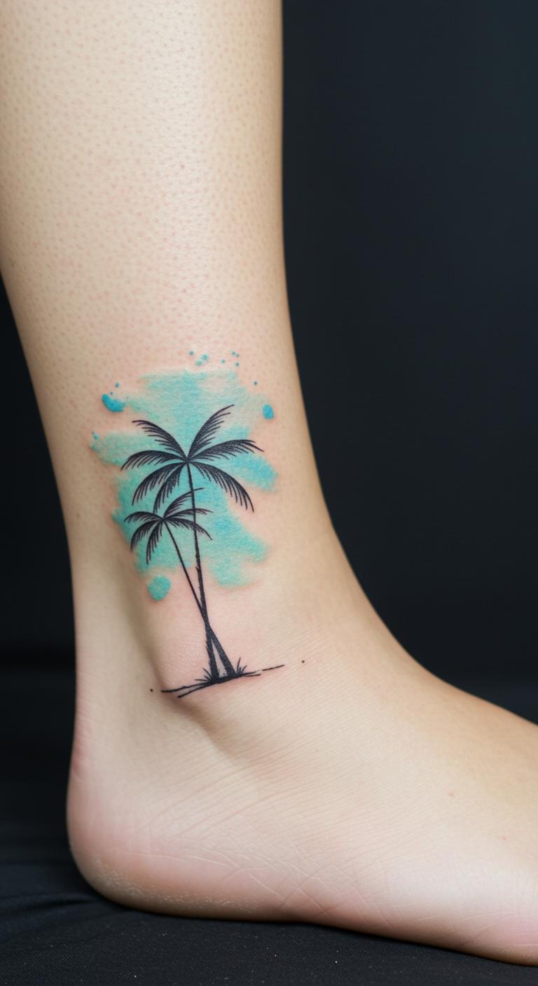 Watercolor palms add a splash of color with minimal fuss. Soft blends of blue and green keep it light on the ankle. Artists charge around $90 for this look. Experiment at home with watercolors on paper to mimic the effect. Use affordable paints to test colors on your skin. Focus on areas that get less sun for vibrancy. Apply basic lotions for healing from your bathroom. Sketch it first with colored pencils for a preview. This design feels artistic yet understated. Keep ink choices simple to match your budget. Combine it with a wave for extra flair. You’ll find it brings a fresh feel to your style.