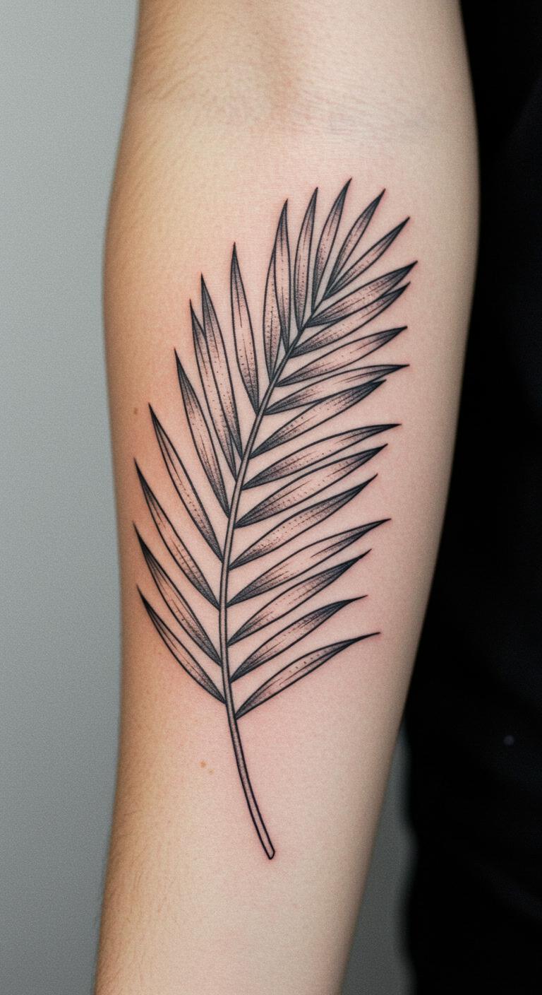 Palm leaves alone offer a fresh take on the classic tree. Just the fronds in simple lines make it unique on the forearm. Expect to pay $60 at a nearby studio. Trace leaf shapes at home with paper and pencil. Add them to a notebook for ideas. Choose spots easy to show off. Use household bandages for protection. Draw on your arm with a pen to plan. This design heals quickly and looks modern. Stick to one or two leaves for simplicity. Mix in a stem if you like. You’ll enjoy how it stands out without overwhelming.