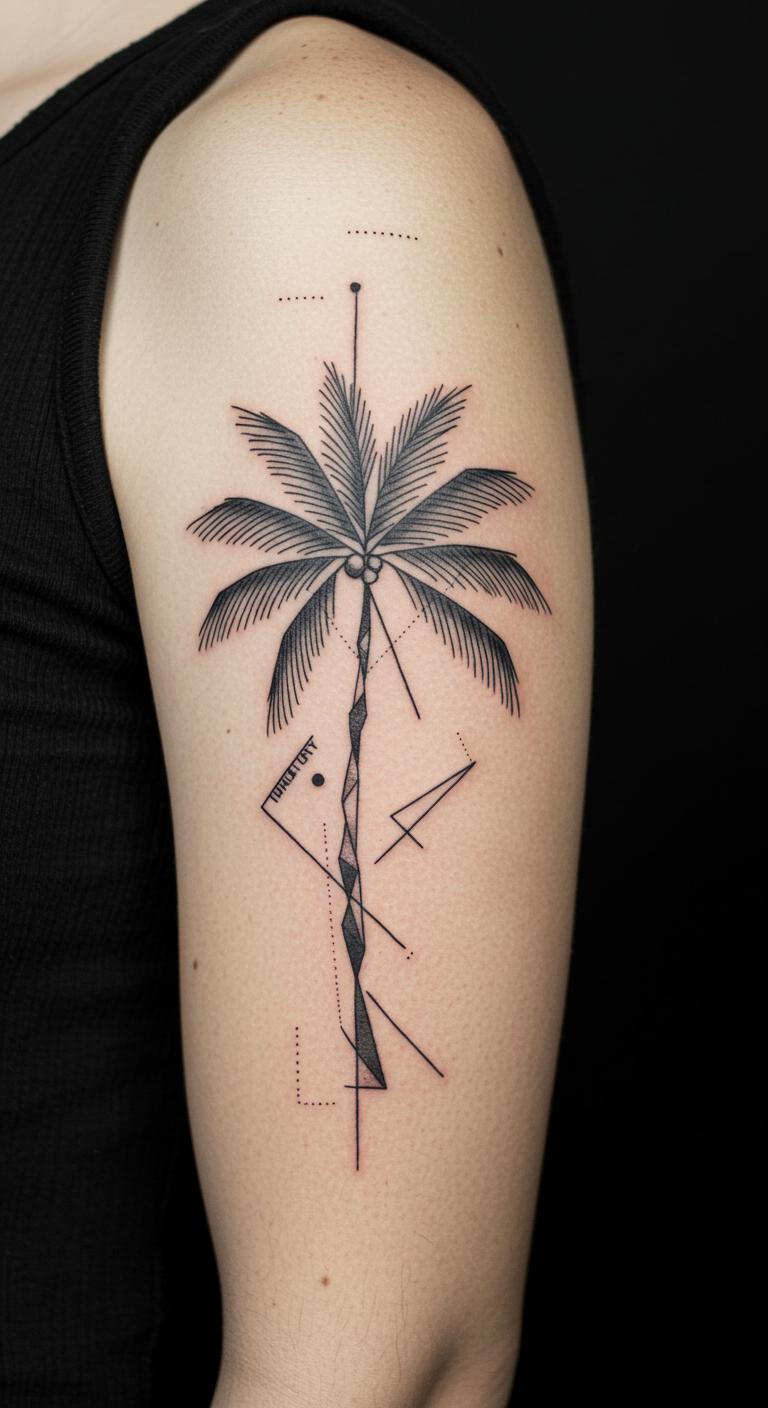 Geometric palms mix shapes for a modern edge. Triangles and lines build the tree on your upper arm. Shops offer this for about $75. Create your version at home with rulers and paper. Use free apps to design patterns. Place it where it flexes with you. Grab cheap ointments for care. Tape a mock-up on your skin first. This style adds an abstract twist. Keep lines straight for ease. Add a circle around it for fun. You’ll love the contemporary feel it gives.
