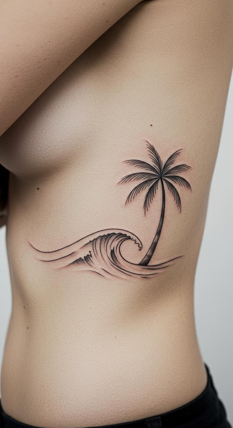 Palms with waves evoke ocean vibes. A tree paired with curves fits the ribcage nicely. Artists price it at $85. Sketch waves at home on plain paper. Use string to outline curves. Put it on less visible areas. Apply simple creams for recovery. Draw the combo on paper towels. This design tells a story of the sea. Limit details to stay budget-friendly. Include a small wave for balance. You’ll feel connected to the coast.