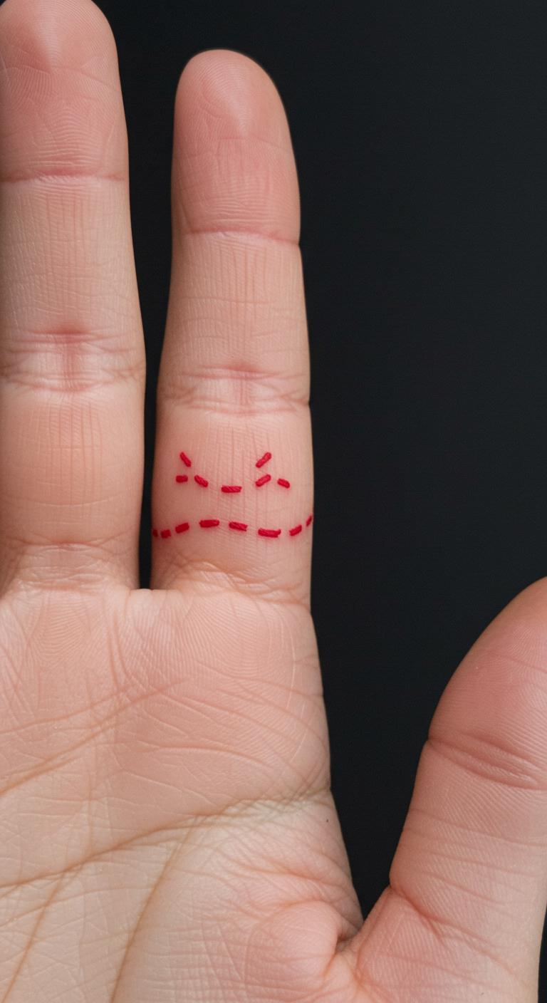 A red stitch on your finger adds fun and whimsy to daily life. It mimics sewing in a cute way. Choose a finger for constant visibility. Sketch stitches on your hand to play around. Budget wisely with artists offering small tattoos for $40. Use sewing thread to mimic the look at home for testing. Opt for dashed lines to keep it light. Bold the key: red stitch. Healing happens fast, in under 10 days. Get a patch test for peace of mind. Personalize it with your initial nearby.