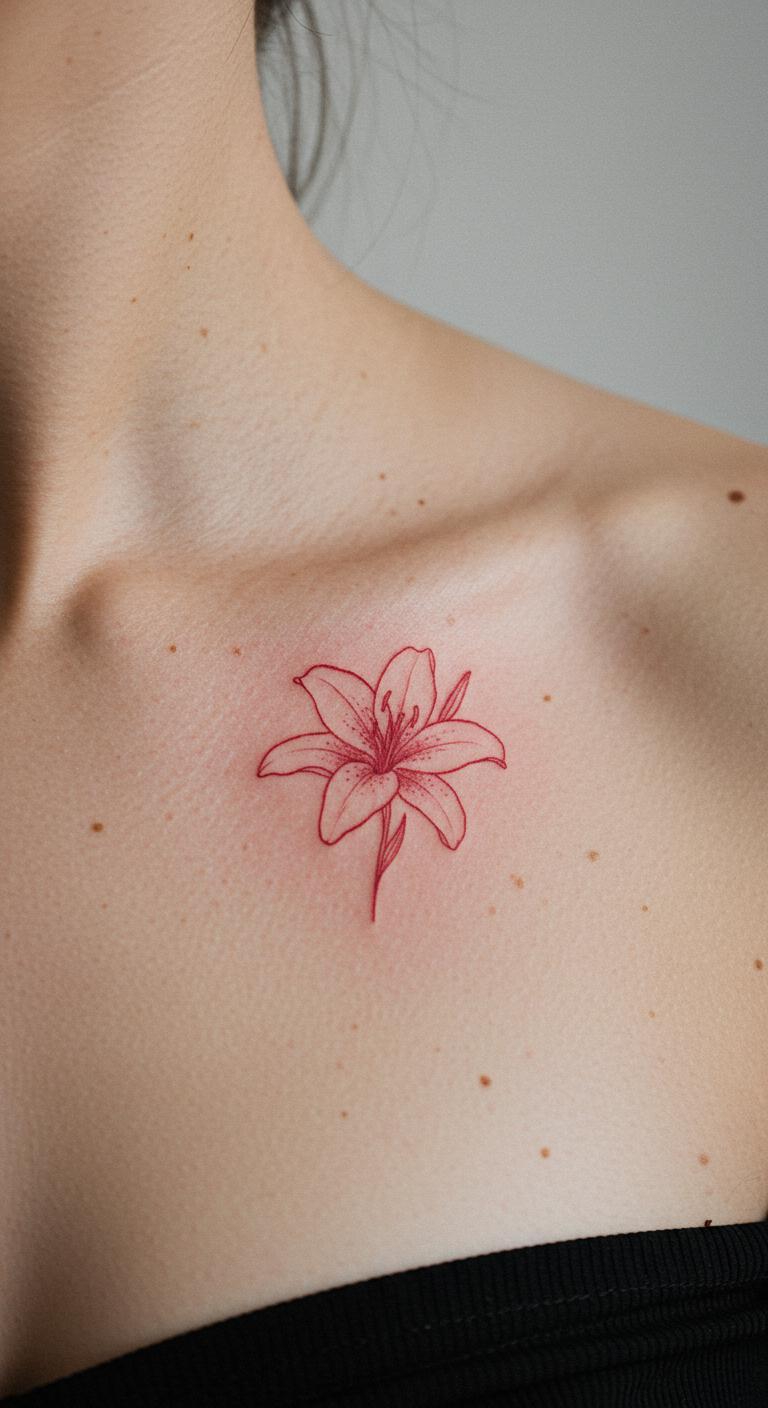 A red lily on your collarbone offers quiet grace and meaning. It symbolizes purity in a small package. Select the collarbone for a elegant hideaway. Draw lilies on tracing paper to refine ideas. Seek out promo deals at studios, around $60. Test with red face paint for a temporary version. Use few lines for elegance. Bold the key: red lily. Plan for one-week healing with easy care. Inquire about safe pigments upfront. Make it special with a stem addition.