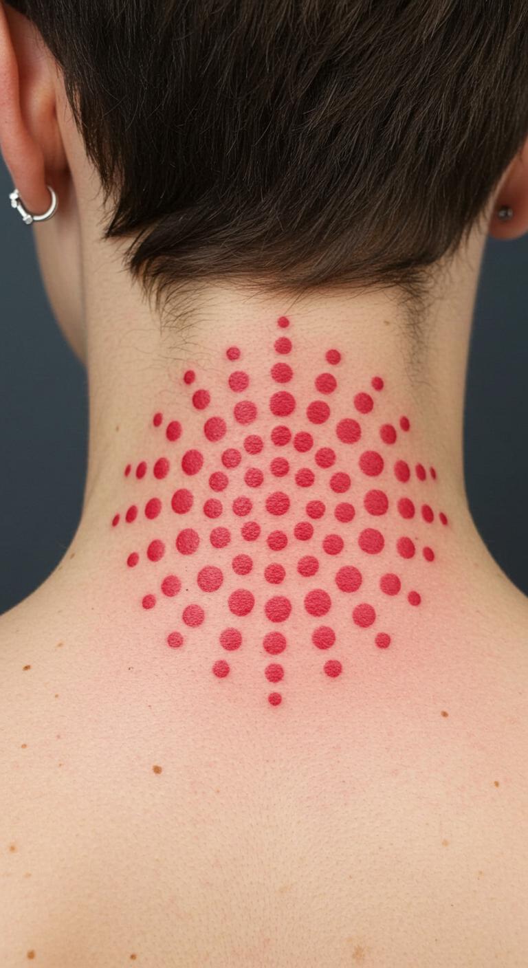 A red dot pattern on your neck brings abstract vibes with ease. It creates rhythm in a tiny space. Go for the neck back to keep it subtle. Dot paper with a red marker to design first. Find artists with flat rates starting at $50. DIY a version using dot stickers for trials. Arrange dots for balance. Bold the key: red dot pattern. Healing is quick, about a week. Verify ink safety before booking. Customize with varying sizes.