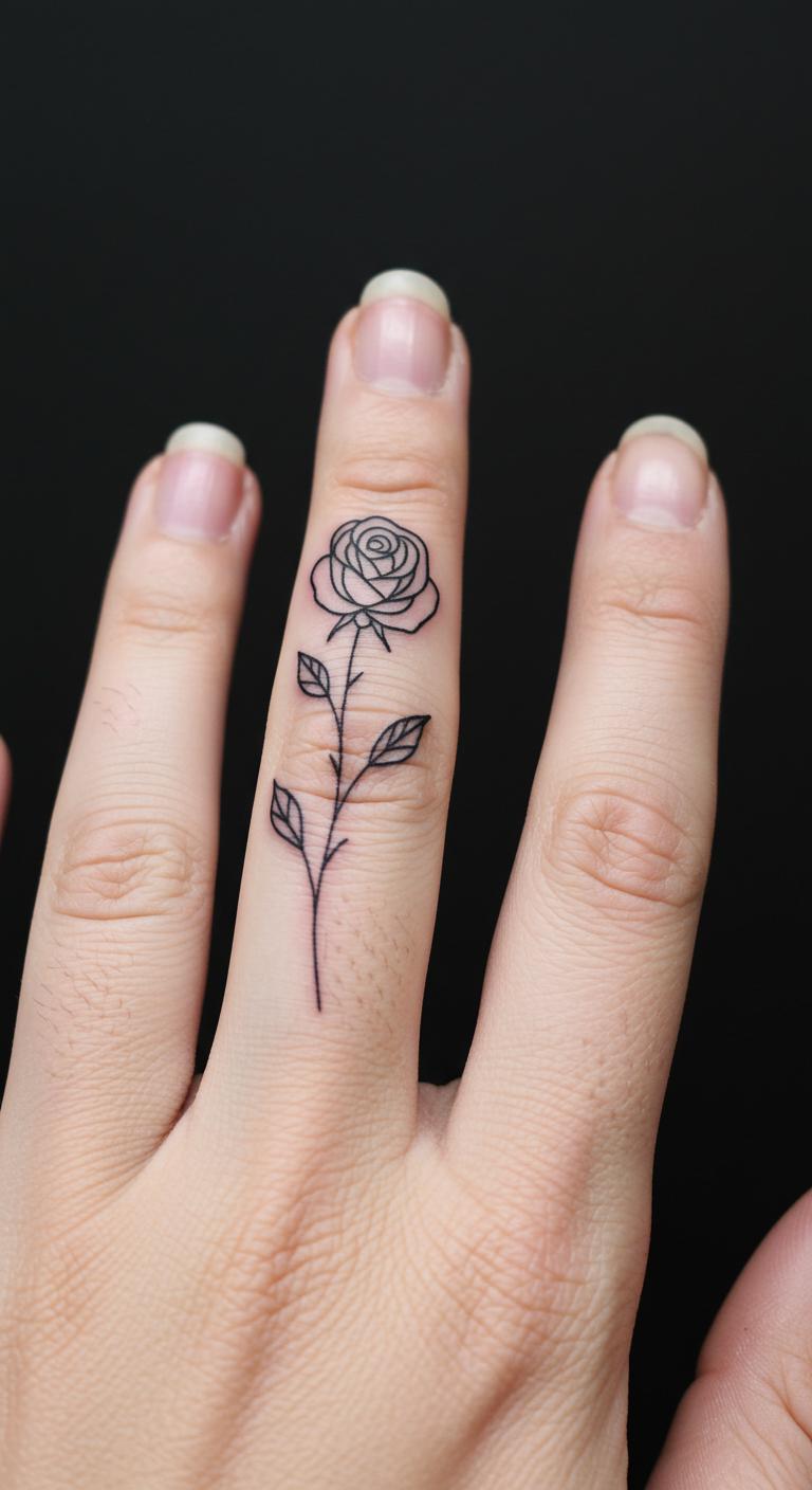 Finger tattoos make a rose feel intimate and personal. Imagine thin lines forming a small rose on your ring finger. It stands out without overwhelming your hand. Try drawing it with a fine-tip marker at home. Experiment with sizes to fit just right. Find an artist who does detailed work for around $40. They might have tools for quick sessions. Opt for black lines to keep it subtle. Pain here is short, so breathe through it. Once done, moisturize with lotion from your cabinet. Avoid rings until it heals. This design boosts your confidence in everyday tasks like typing or gesturing.