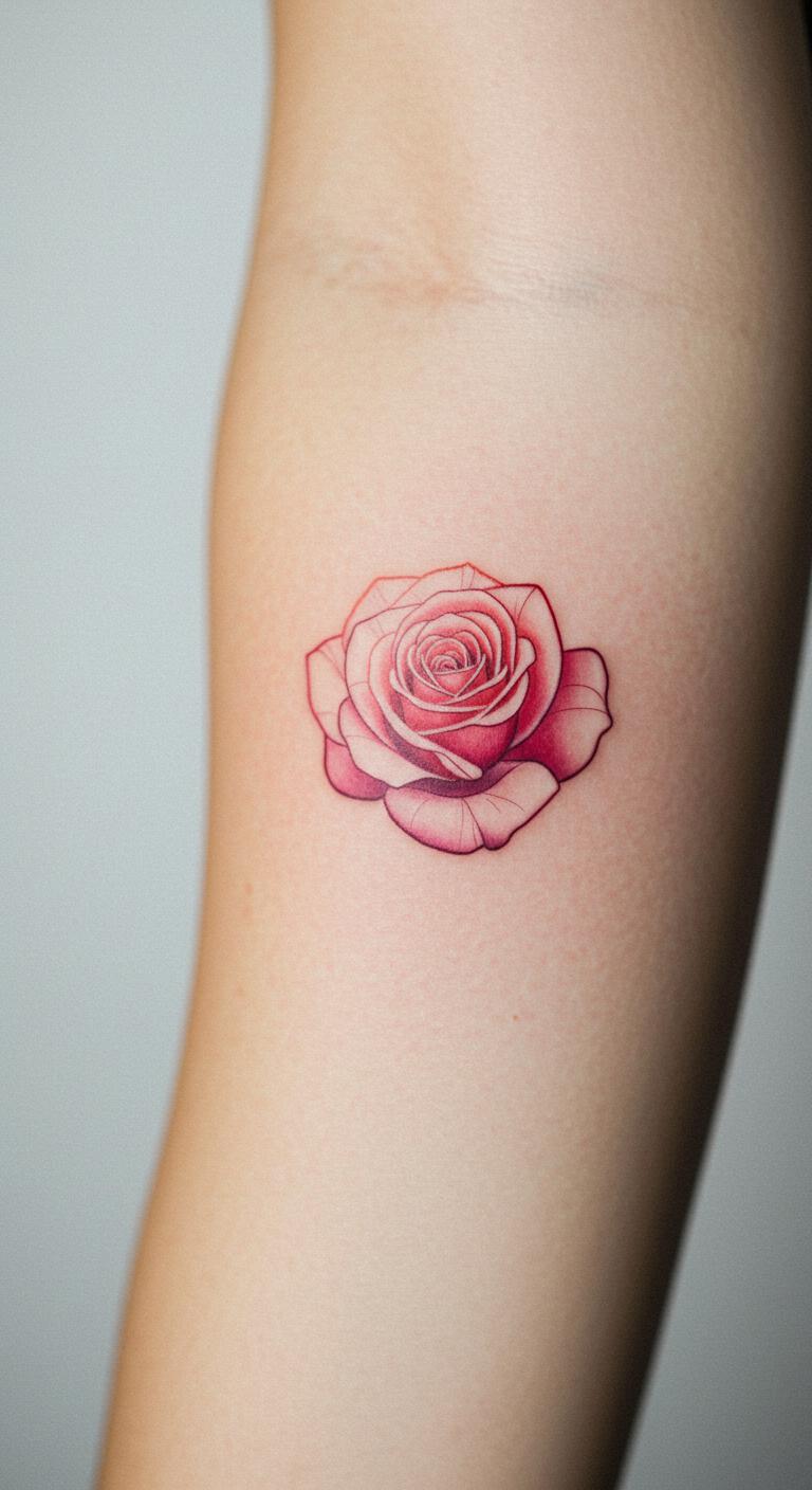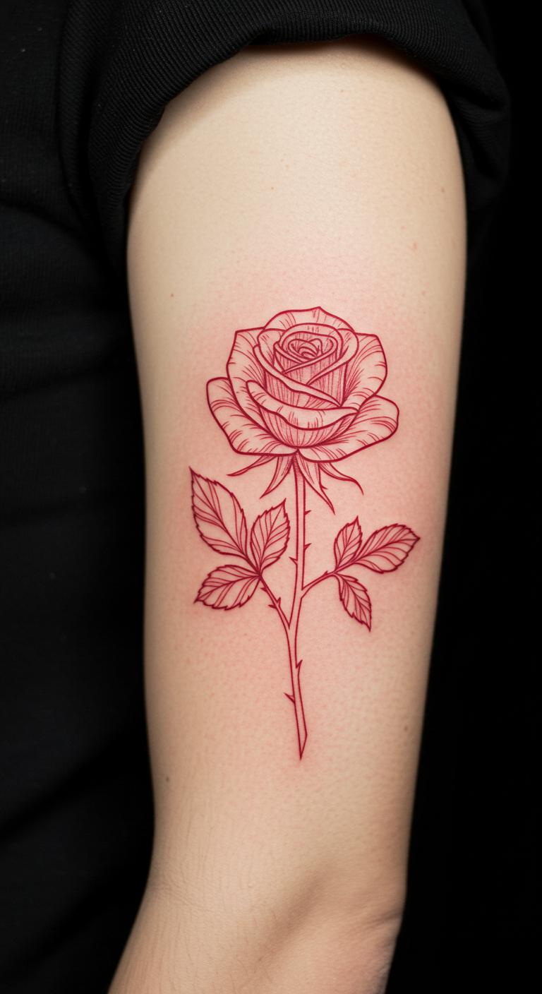 Red roses stand for love and energy. Think of slim red lines forming a rose on your back. It feels passionate yet simple. Sketch with red crayon to preview. Play with sizes for the perfect match. Local artists might charge $60 for color work. They use standard inks for vibrancy. Pick red to express your heart. Pain fades fast on larger areas. Care for it with oil from your kitchen. This design sparks confidence in your relationships.