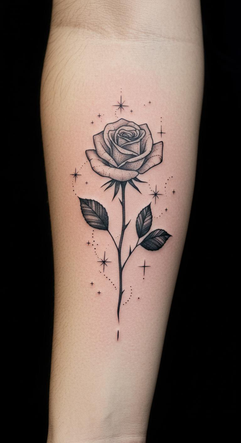 Star roses combine night magic. Think of stars in the petals on your arm. It sparkles with meaning. Draw stars around a rose sketch. Mix shapes fun. Artists offer for $60. They add points. Choose night themes. Heal under covers. This tattoo combines your confidence.