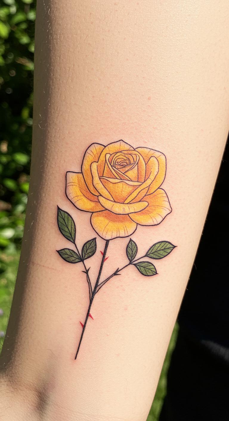 Yellow roses symbolize friendship and fun. Picture soft yellow lines of a rose on your shoulder. It adds a pop of color without fuss. Color it in with markers at home first. Test shades to match your style. Find deals at tattoo fairs for about $80. Artists mix colors with everyday supplies. Choose yellow for a cheerful feel. The process takes little time if kept small. Heal it by avoiding sun with a hat. This tattoo makes you smile and feel connected.
