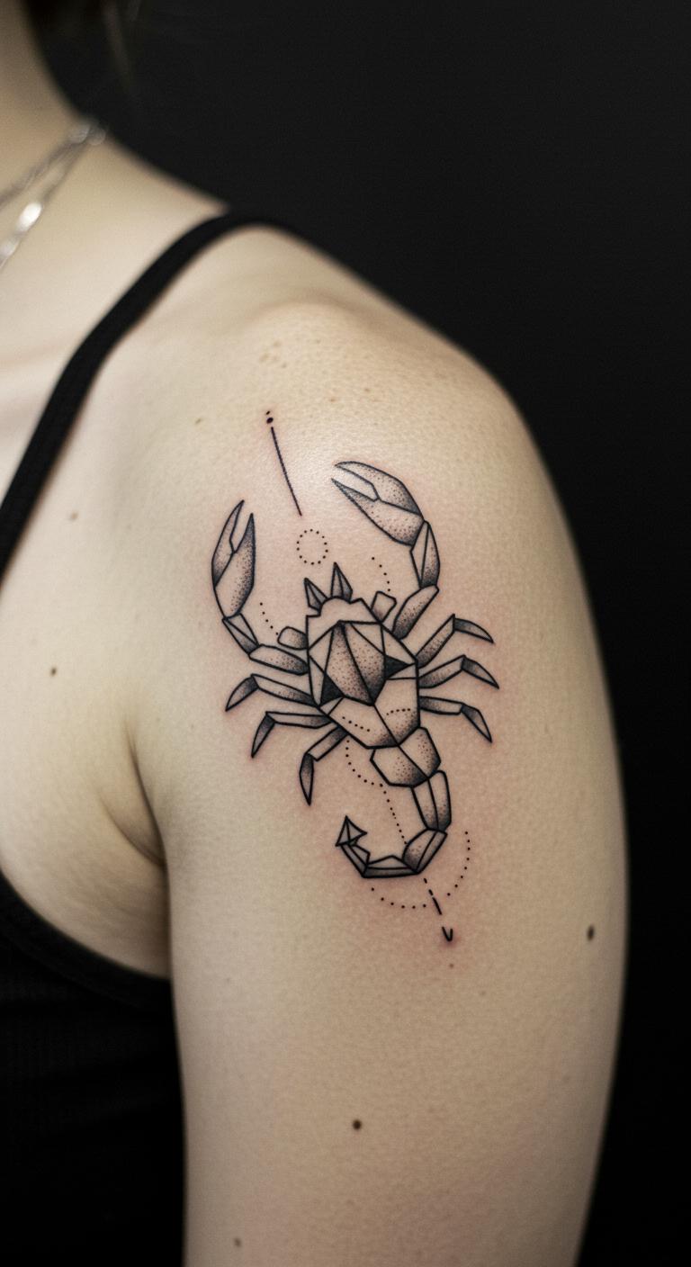 Triangles and squares form a bold Scorpio icon. Keep lines straight for that modern edge. Put it on your forearm for easy views. Look for affordable artists online who charge by the hour, starting at $40. Practice with geometric stencils at home using paper and a ruler. Change the angles to match your style. This tattoo highlights your strength. Add a personal twist like a favorite color. Wear it as a daily motivator.