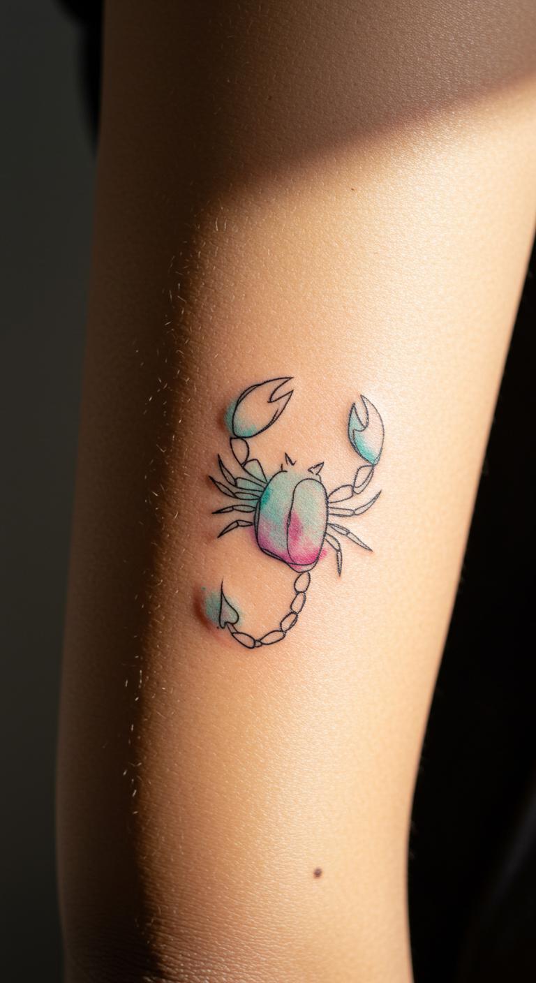 Blend in soft colors for a watercolor hint. Stick to the scorpion shape. Try your upper arm for balance. Search for artists who mix styles affordably, around $70. Experiment with watercolors on paper at home. Add just a touch of hue. It adds a dreamy feel. Boost your mood with this twist.