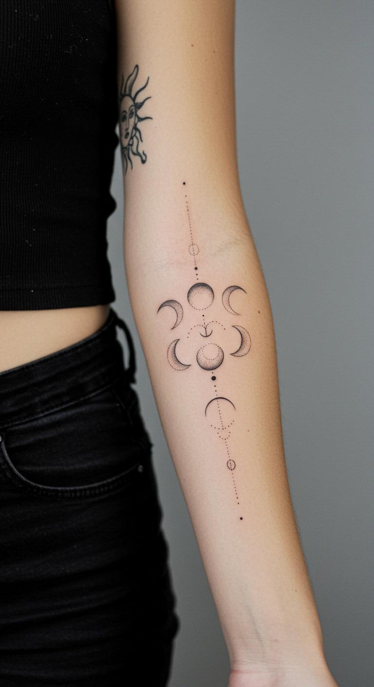 Sun and moon phases mark time on your arm. Outlines keep it straightforward. Draw phases in a notebook first. Free astronomy apps provide templates. Tape images to your arm for testing. This DIY route is cost-effective. Use consistent line weights. Studios may offer celestial packages. Phases symbolize balance, so link them personally. The design holds meaning over years.