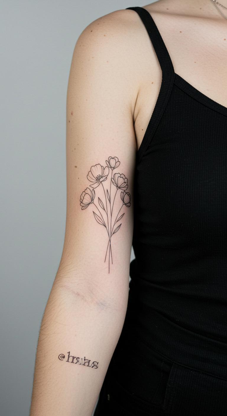 A few flower buds make a bouquet. They cluster neatly. Pick flowers and trace them. Free floral templates online help. Pin drawings to your arm. This step is creative and affordable. Use light lines. Studios have flower specials. Bouquets represent beauty. The tattoo blooms with meaning.