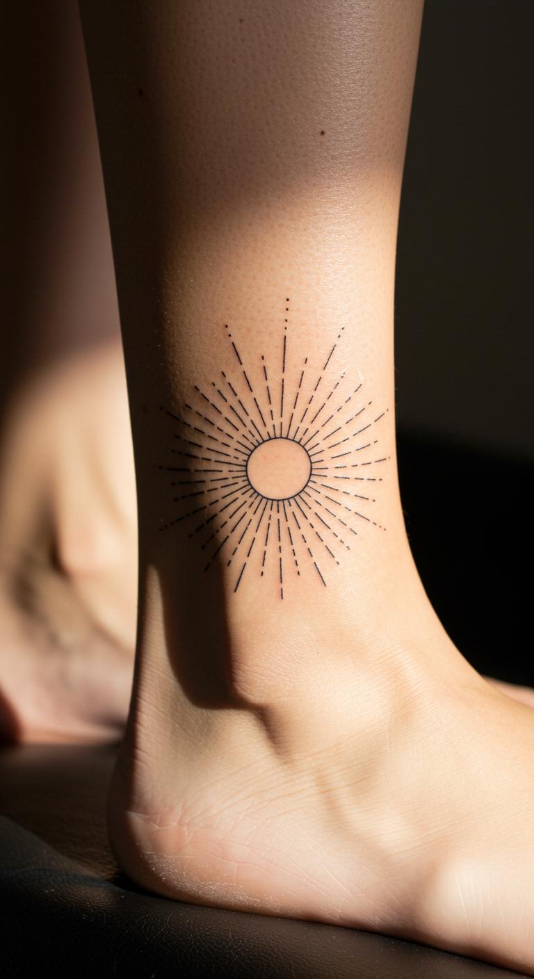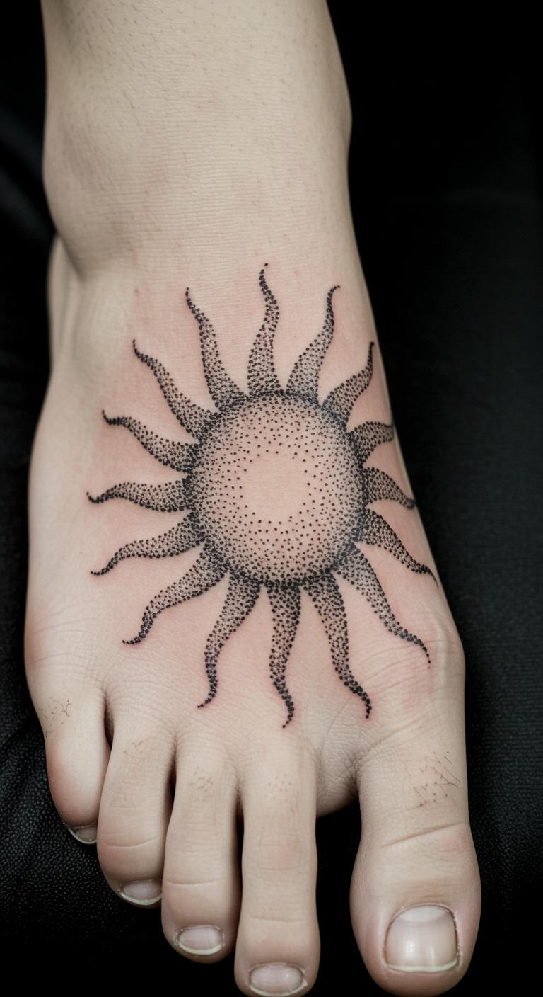 Dotwork suns build the design with small dots for texture. It creates a dotted sun that pops. Find dot patterns online for free. Practice with a dot marker on paper. Do it in sections: center dots, then outer ones. A basic version costs little at a shop. Use dot stickers as a trial. Put it on your foot for easy cover. Customize with more dots for density. This method is precise and cool.