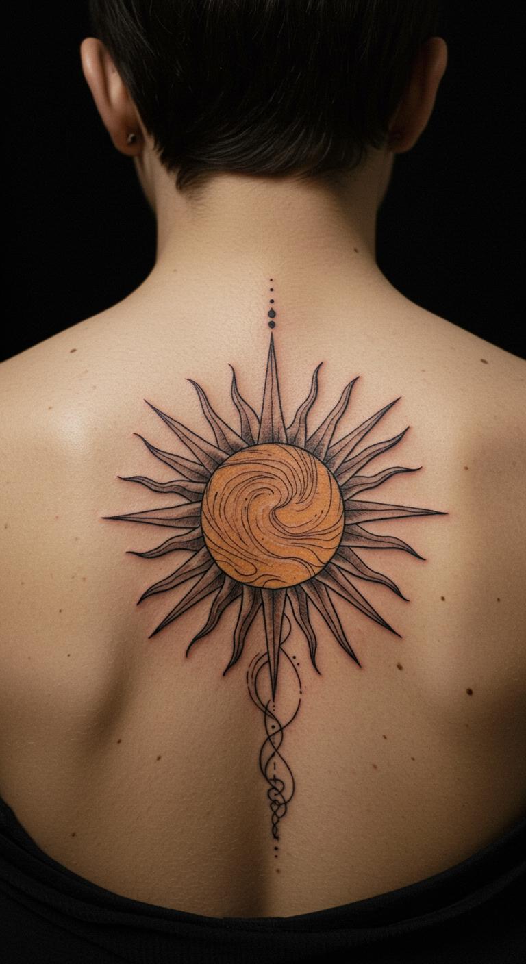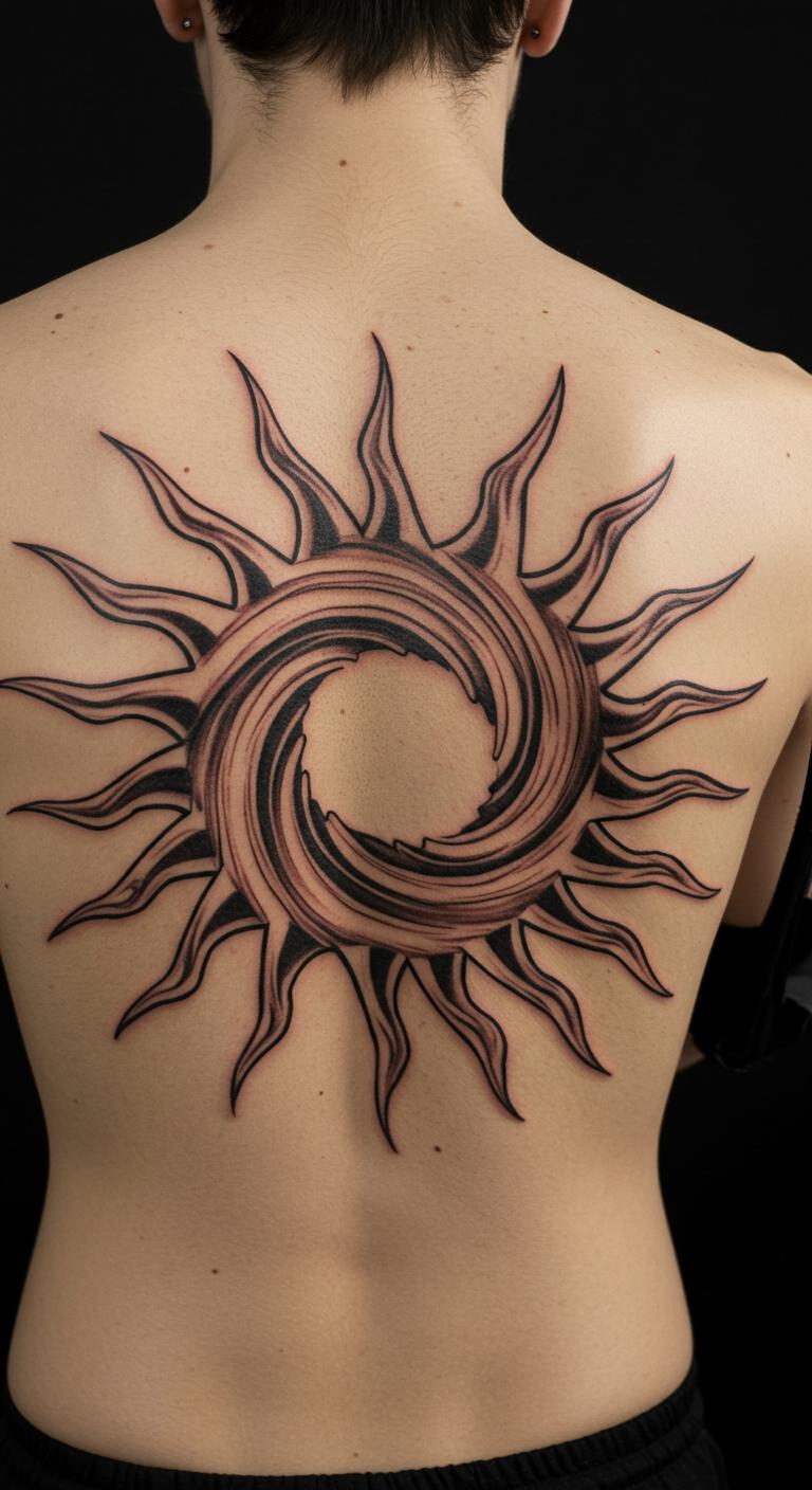Surreal suns twist the design into abstract forms. They play with shapes for creativity. Watch free videos to get ideas. Draw abstracts with basic tools. Work in layers: base, then twists. Go small for budget reasons. Abstract temporaries are easy to find. Put it on your back for impact. Add unique twists like waves. This idea sparks imagination.