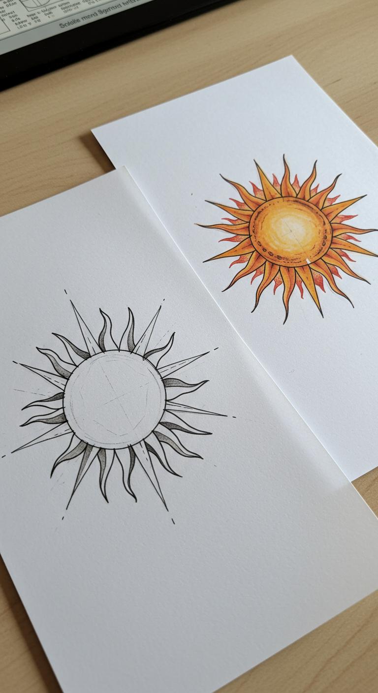 Mix styles like lines and dots for unique suns. Combine in sketches. Practice blending. Keep it mixed but simple. Find budget artists. Test mixed temporaries. Place for show. This creates something new.