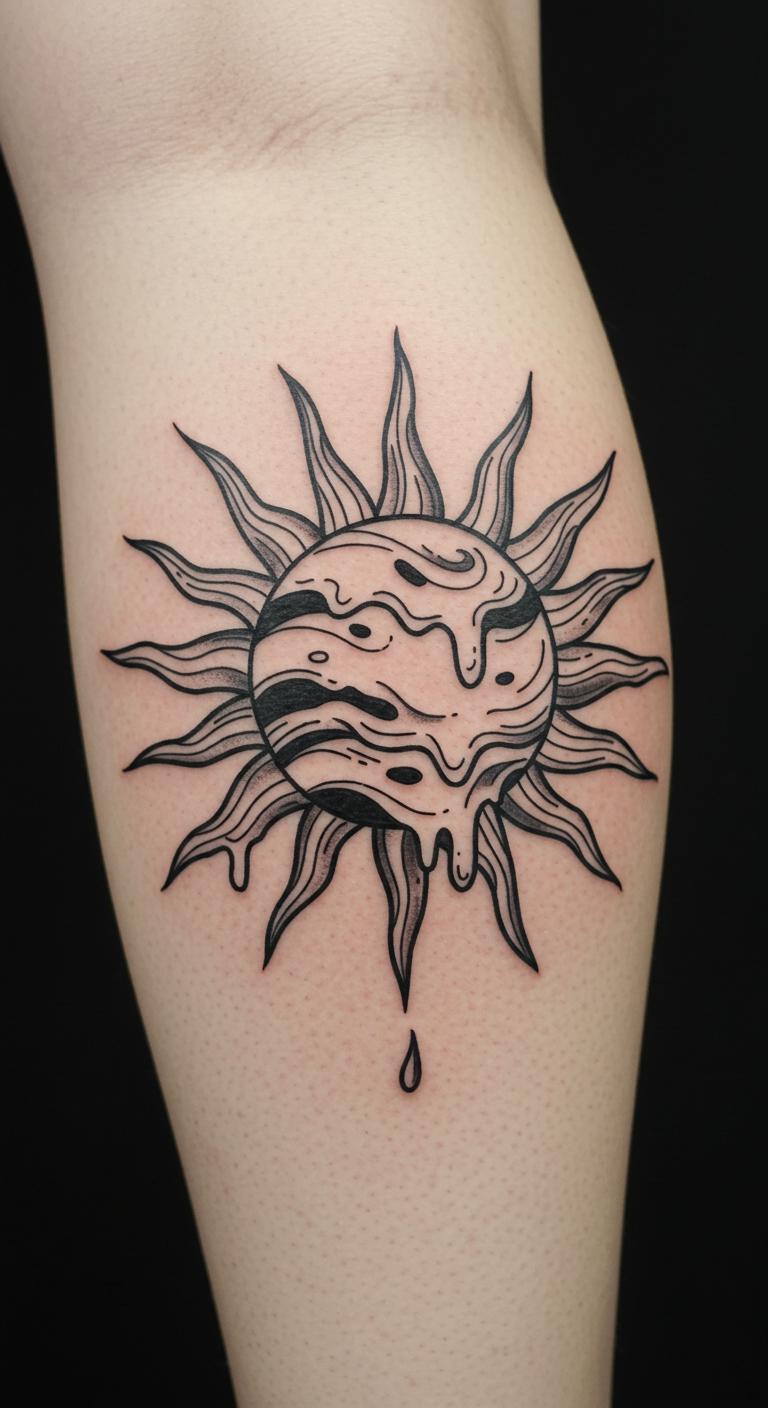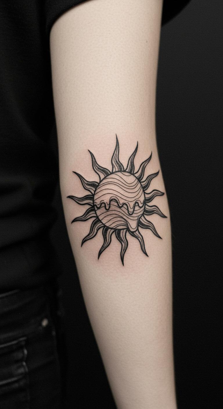The melting sun adds a fun, surreal twist to the classic design. It shows the sun with drooping lines for a modern feel. Start by watching free YouTube tutorials on drawing surreal art. Use inexpensive markers to experiment on your arm. Break the process into steps: outline the sun, then add melt effects. Opt for a small size to cut expenses. A temporary sticker from online shops costs pennies. Place it on your ankle for easy hiding. Pair it with colors if your budget allows, but stick to black for simplicity. This idea sparks conversation. Try a henna version first to see how it looks.