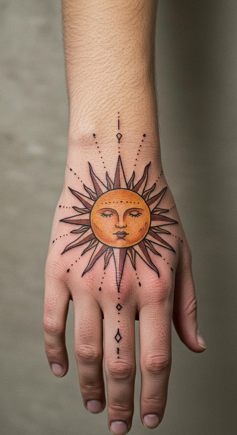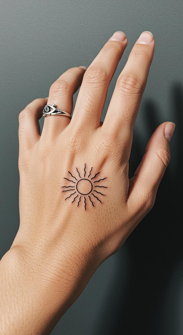 Hand tattoos put your sun design front and center. They use clean lines for a subtle pop. Sketch ideas on your palm with a free app. Keep costs down by choosing a small design that takes less time. Draw the sun in sections: circle, then rays. A local shop might offer this for $40 or less. Test with a temporary tattoo from a drugstore. Think about daily activities; hands see a lot of wear. Add a tiny dot for personalization. This spot boosts your style without much effort. Practice drawing on paper to get it right.