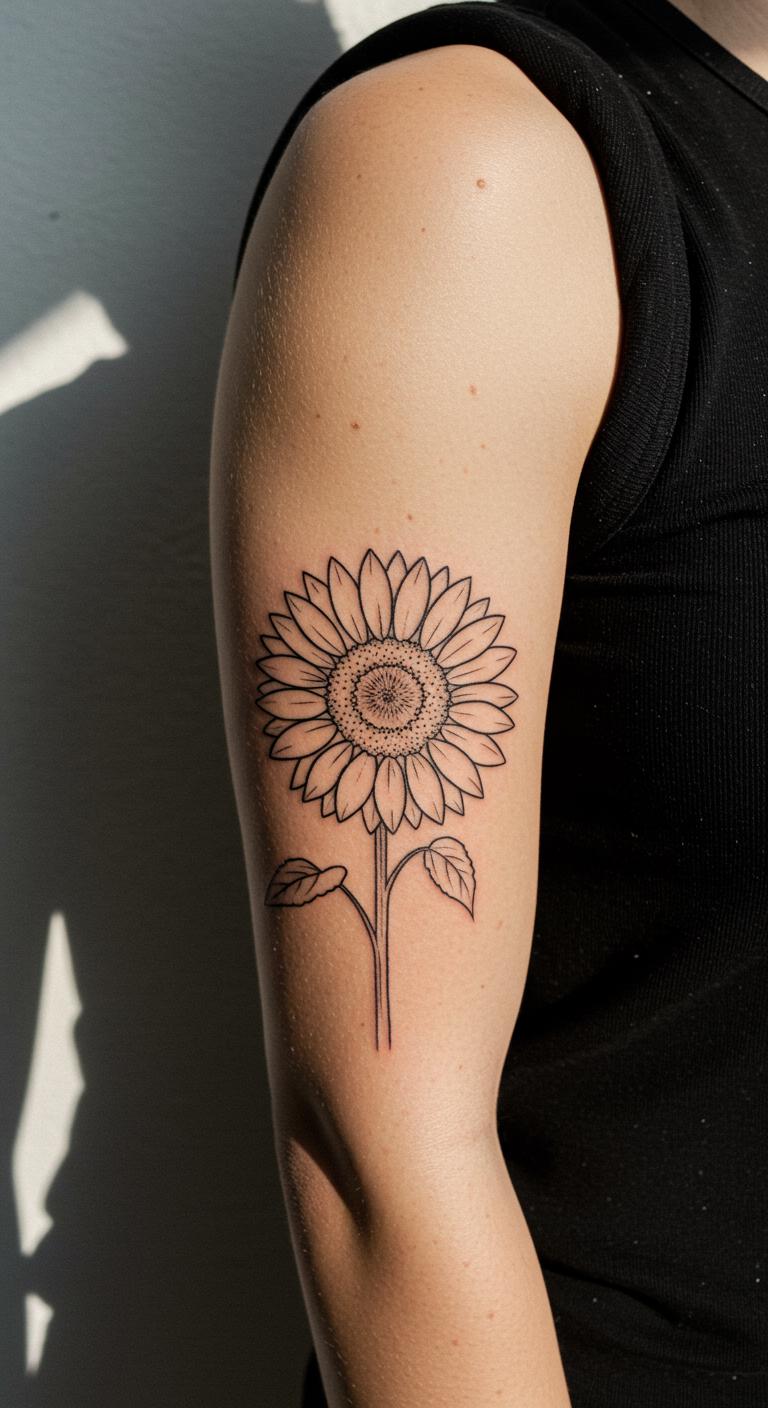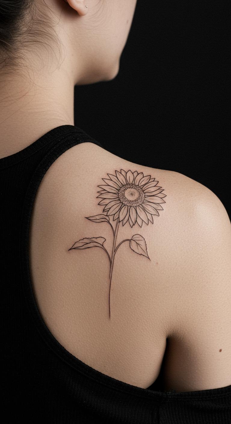 Choose a delicate outline for your shoulder sunflower. It feels light and graceful. Trace fine lines on paper first. Keep it elegant. Look for fine-line experts under $60. Position it on your shoulder for artful hide. Draw with fine pens at home. This adds a personal layer. Preview with light sketches. The result is beautifully simple.