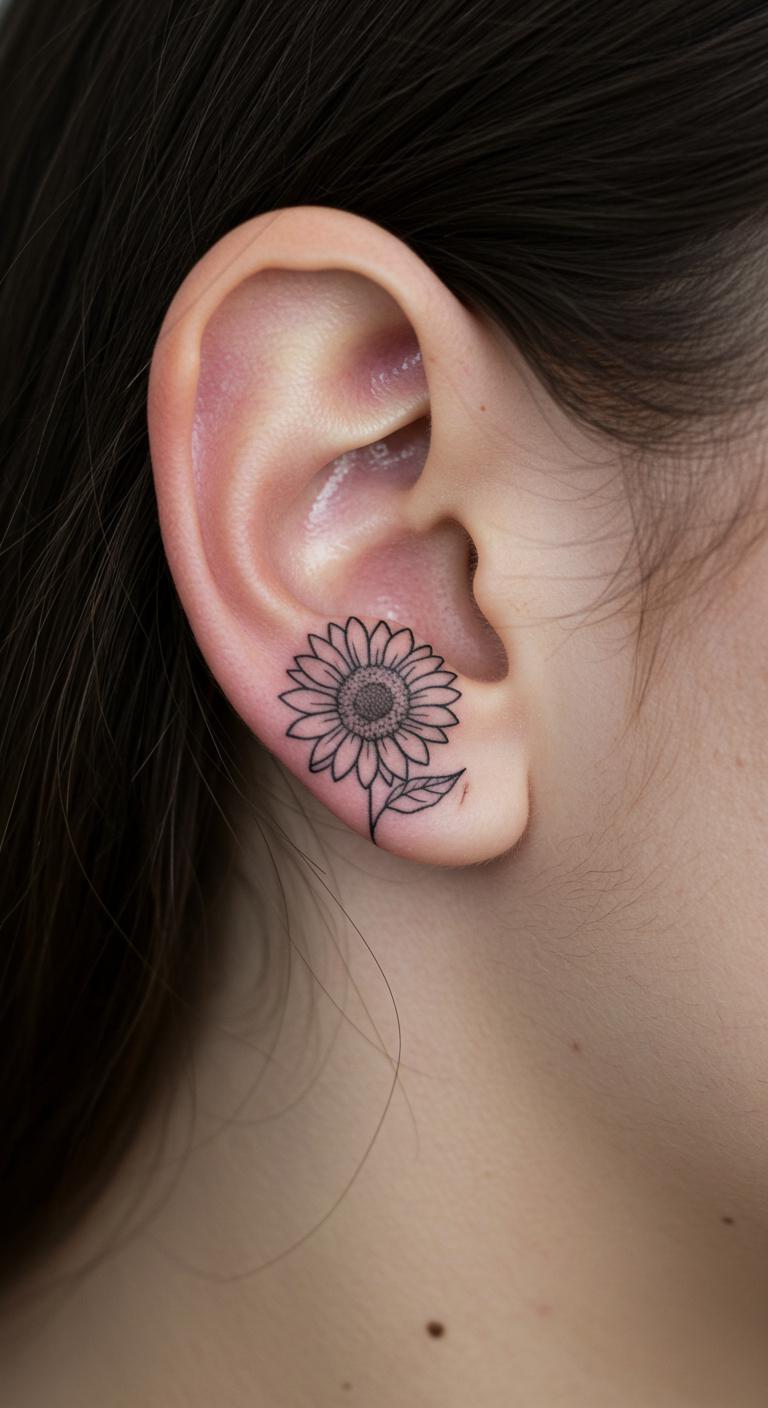 Place a sunflower behind your ear for a hidden gem. It brings quiet joy to your day. Practice by drawing on your ear with an erasable pen. Focus on a compact shape. Find artists who do quick sessions for about $40. This spot keeps it private yet accessible. Add a tiny stem using free apps for design tweaks. It’s a smart way to personalize. Try temporary versions from craft stores first. The result fits any style without much cost.