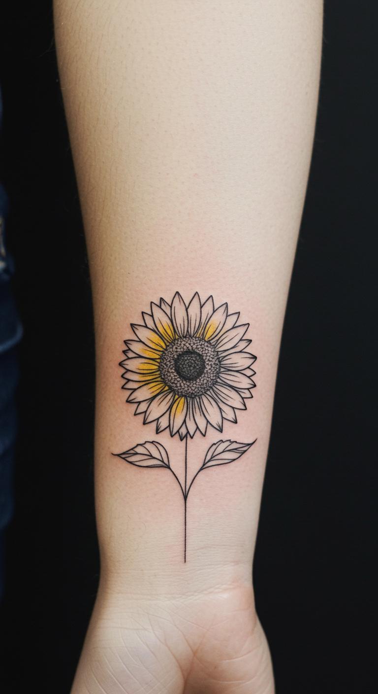 Use a subtle color on your sunflower for a gentle pop. It keeps the design fresh and light. Color in the center with markers during practice. Stick to one shade. Look for color add-ons at low-cost shops, under $90. Put it on your wrist for visibility. Create your version using watercolor pencils at home. This is an affordable way to experiment. The effect is simple and bright. Preview with colored temporary tattoos.