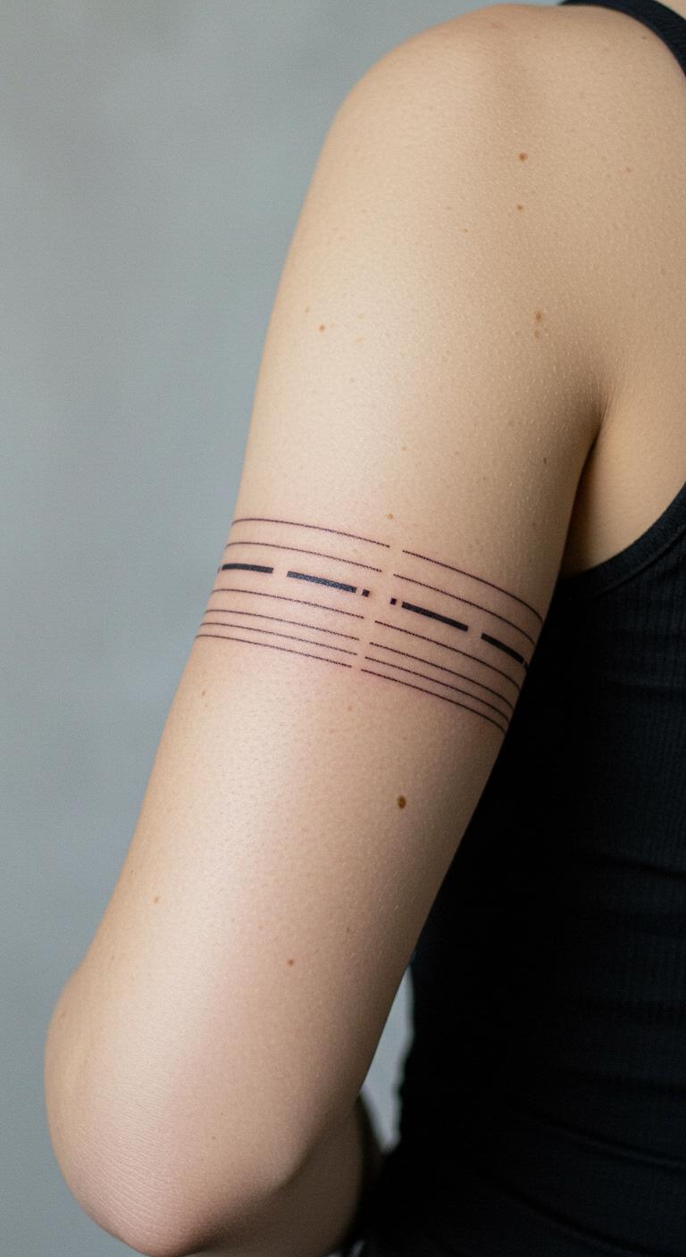 An armband of lines creates a band effect on your arm. Keep it symmetrical. Wrap around the upper arm. Draw lines with a straight edge on paper—free. Digital aids online help align them. Black bands look sharp. Look for band tattoo offers. Add a pattern break for personalization. These stay intact easily. Use string to mock it up at home. Simple and cheap.