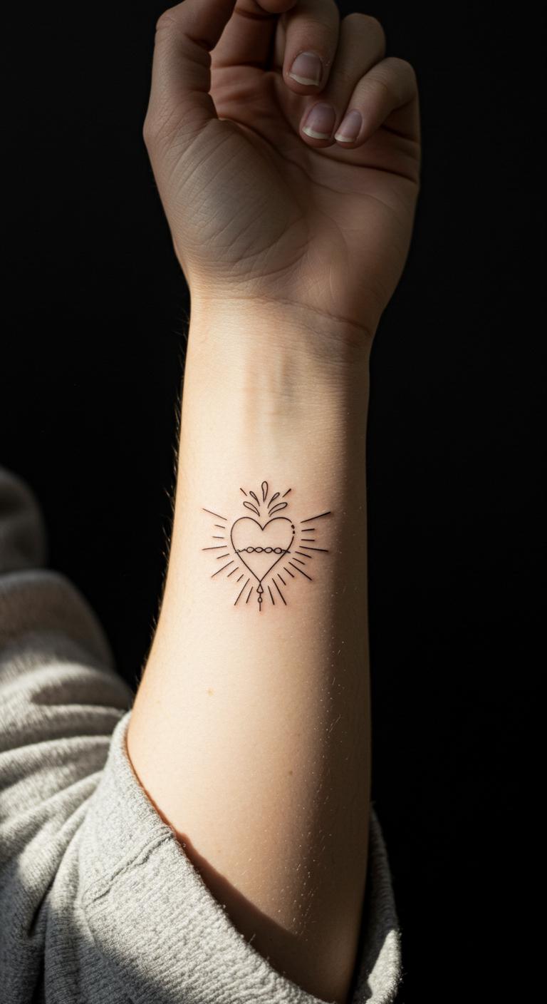 A sacred heart motif brings emotion with clean lines on your arm. Keep it symbolic. Try the wrist spot. Draw hearts on paper—free activity. Online tools adjust details. Black ink suits it. Seek budget motif pros. Add flames for touch. Hearts last with care. Use templates at home first. Easy on the wallet.
