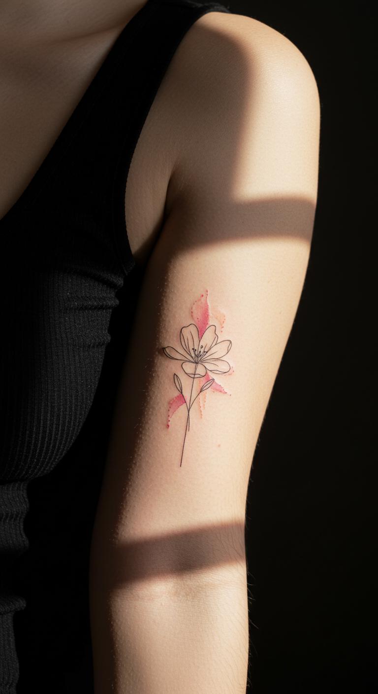A flower with light watercolor adds color subtly on your arm. Use minimal shades. Place on the arm creatively. Paint flowers on paper—cheap fun. Free apps add accents. Choose colors wisely. Find watercolor deals. Make it your own. Flowers brighten up. Test with paints at home. Saves money.