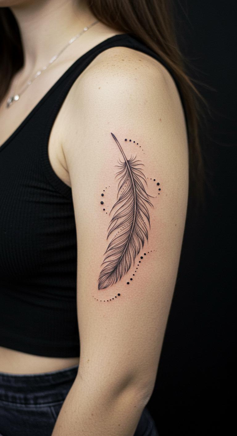 A feather with dots adds lightness on your arm. Combine lines and dots. Position on the arm freely. Draw feathers on paper—free. Online aids add dots. Black for effect. Find feather deals. Make it detailed. Feathers fade slowly. Dot with a pen at home first. Affordable test.