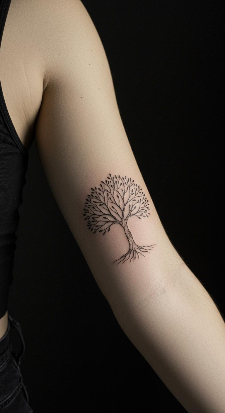 A simplified tree of life grows on your arm. Use branch lines. Place on the arm meaningfully. Sketch trees on paper—free. Digital creators assist. Black trees stand. Look for tree offers. Add roots. Trees hold strong. Draw with branches at home. Easy and cheap.
