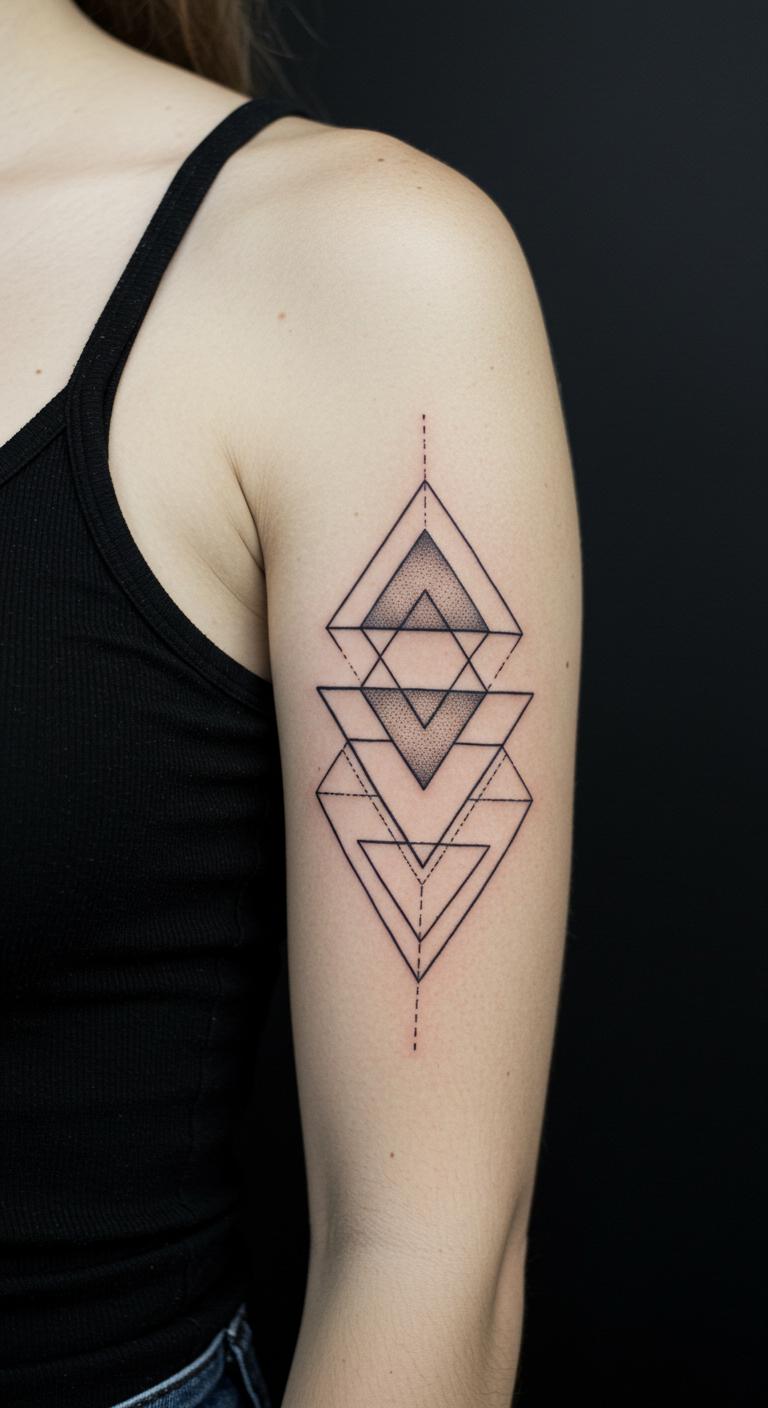 Stacked triangles give a modern edge with straight lines on your arm. Layer them for depth. Position on the bicep for a bold statement. Draw triangles with a ruler on paper—it’s straightforward and free. Online programs help arrange them affordably. Black ink makes them stand out neatly. Check for budget-friendly artists in town. Customize by varying sizes. These tattoos maintain shape over time. Practice layouts at home with tape. It’s an easy way to plan without extra costs.