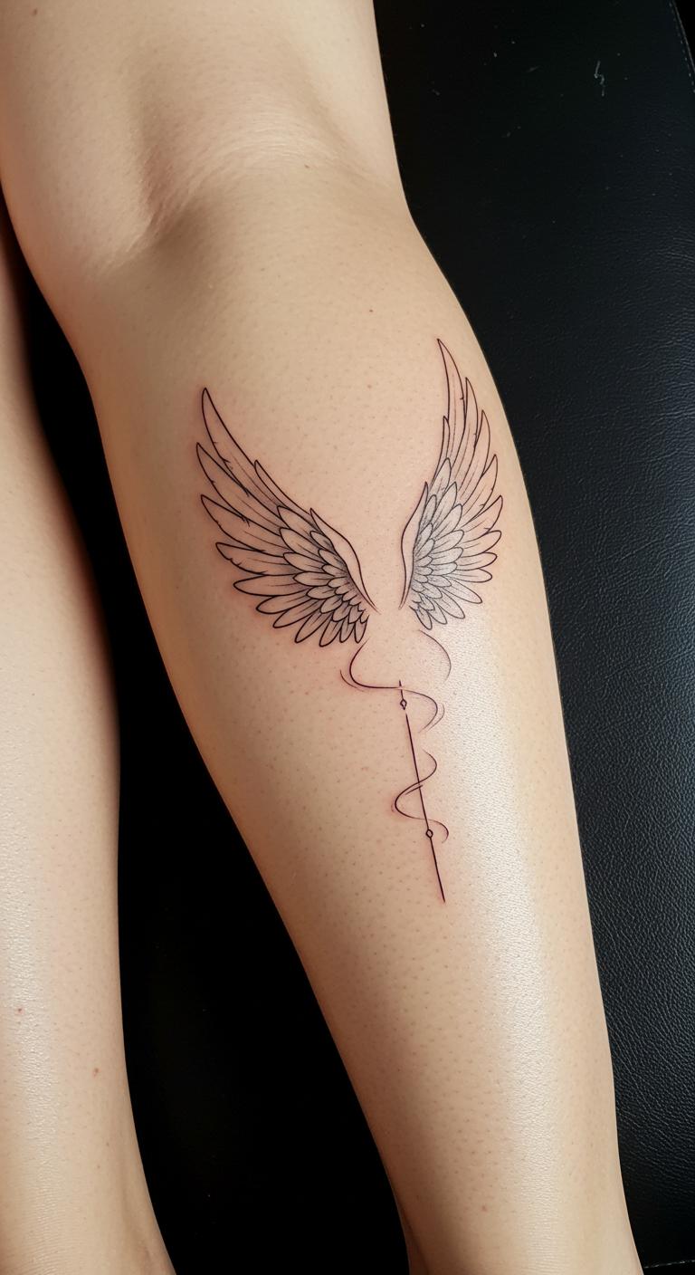 Angel designs on your leg symbolize safety and strength in a sleek form. Keep them tiny on your thigh for grace.