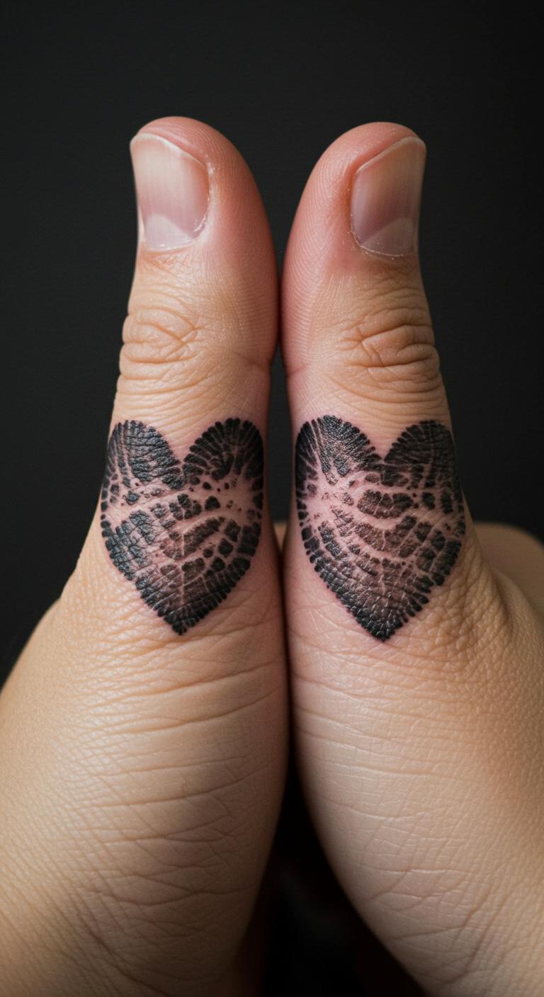 Your prints, one heart. These personalized tattoos show unity. Try thumbs for daily view. Costs around $55. Press thumbs on paper at home. Trace the shapes. Keep it authentic. Great for unique pairs. Bold the tip: mix prints. Search affordable options. Use ink pads for practice. Create a DIY stamp. Keep it personal.