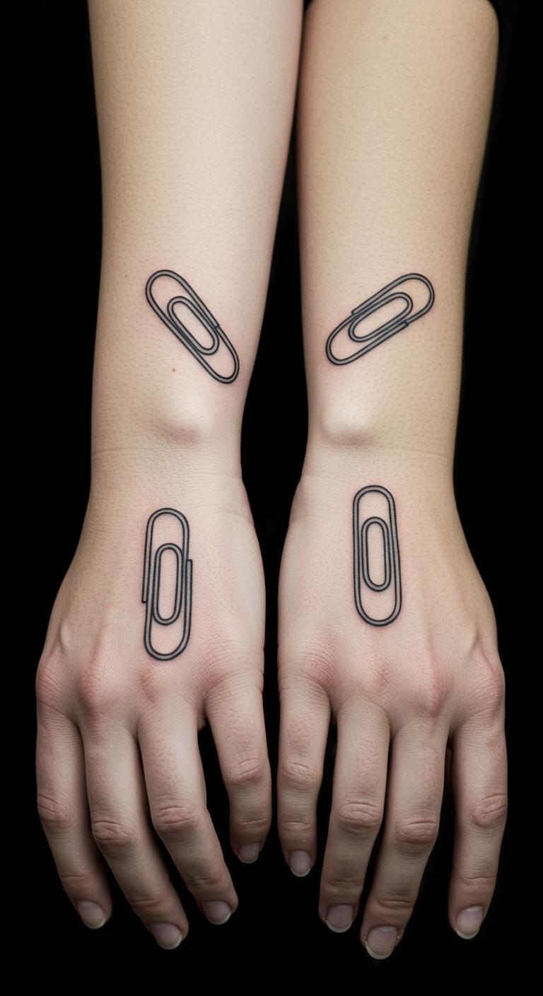 Hold on tight. Paper clip tattoos mean sticking together. Go for wrists. Prices at $40. Draw clips from office supplies. Loop them creatively. Keep it modern. Great for everyday pairs. Bold this: link designs. Find cheap sessions. Practice with clips. Make a DIY with wire. Focus on simplicity.