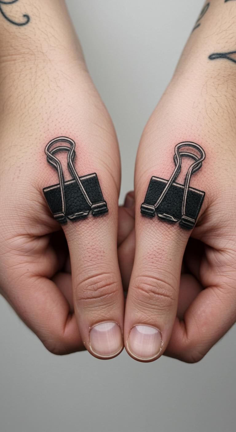 Clip your stories. Binder tattoos symbolize holding on. Place on thumbs. Budget under $50. Draw clips from supplies. Add grips with lines. Keep it functional. Suits practical pairs. Bold this: secure the design. Look for office-themed artists. Practice with real clips. Make a DIY with metal. Focus on grip.