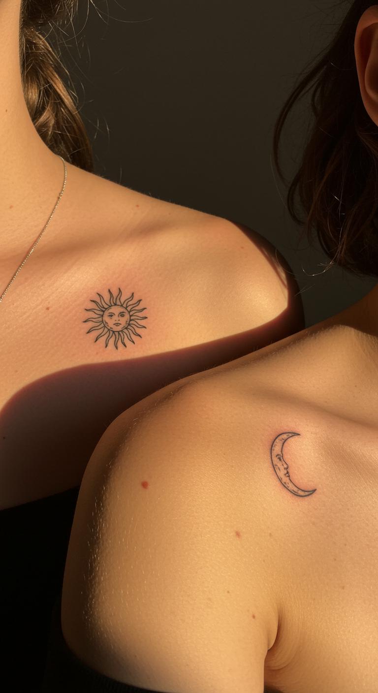 Day and night together forever. Sun and moon tattoos highlight complementary vibes. Put them behind your ears for subtlety. Prices hover around $40 each. Draw rough versions at home with a pencil. Experiment with placement using stickers. Keep the design clean and small. This works for any duo. Bold the advice: match the style. Check local fairs for cheap artists. Use phone apps to preview how it looks. Try a DIY stamp with ink and a carved potato. It’s fun and free. Focus on low-pain spots. Share the process with photos for memories.