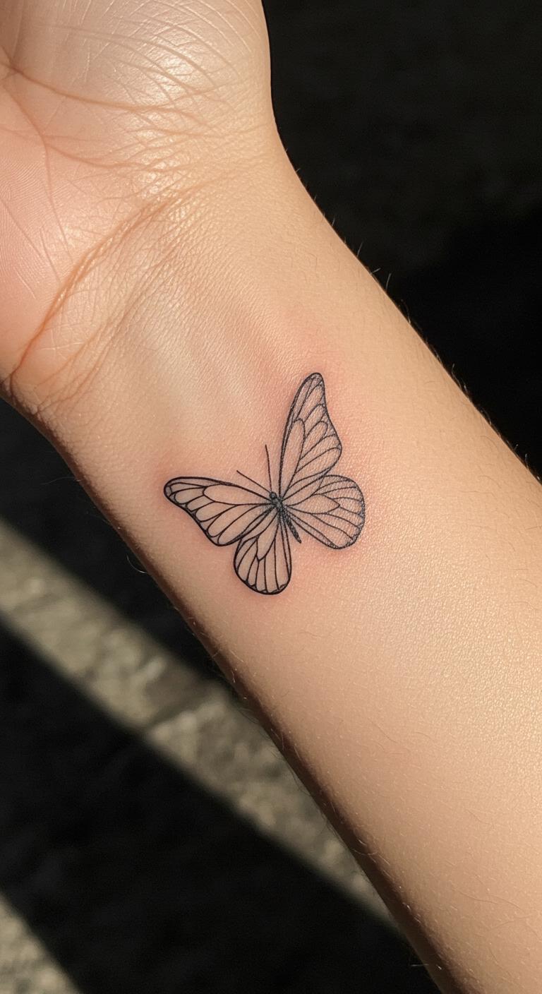 Butterflies symbolize transformation and freedom, making them popular minimalist tattoo choices. Thin lines and simple wing outlines keep the design light. This small design suits wrists, ankles, or behind the ear. Butterflies tattooed this way cost less because of their size and uncomplicated form. You can sketch your own butterfly shape on paper or body-safe markers at home to personalize the look. Combine the butterfly with small dots or lines for movement without complexity. This design makes a lasting personal marker with minimal effort.