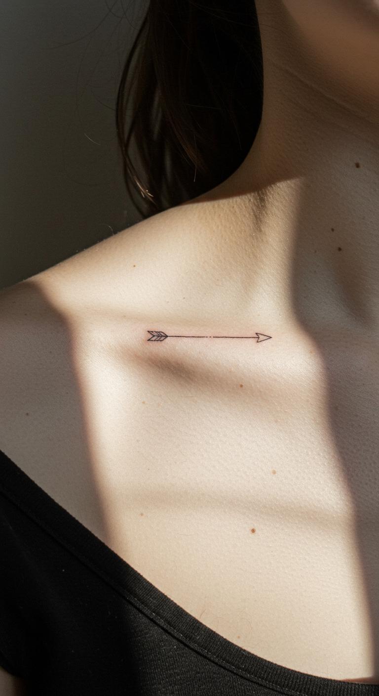 The collarbone provides an elegant, flowing canvas. A single line or arrow looks graceful here. Sketch ideas on paper and trace lightly on your skin. Seek out student artists for lower fees at certain studios. Small tattoos take less time, saving money. This placement appeals to those seeking a touch of sophistication. Test with wash-off markers to get the feel. Protect the area with loose clothing post-tattoo. Pick designs that enhance your personal narrative.