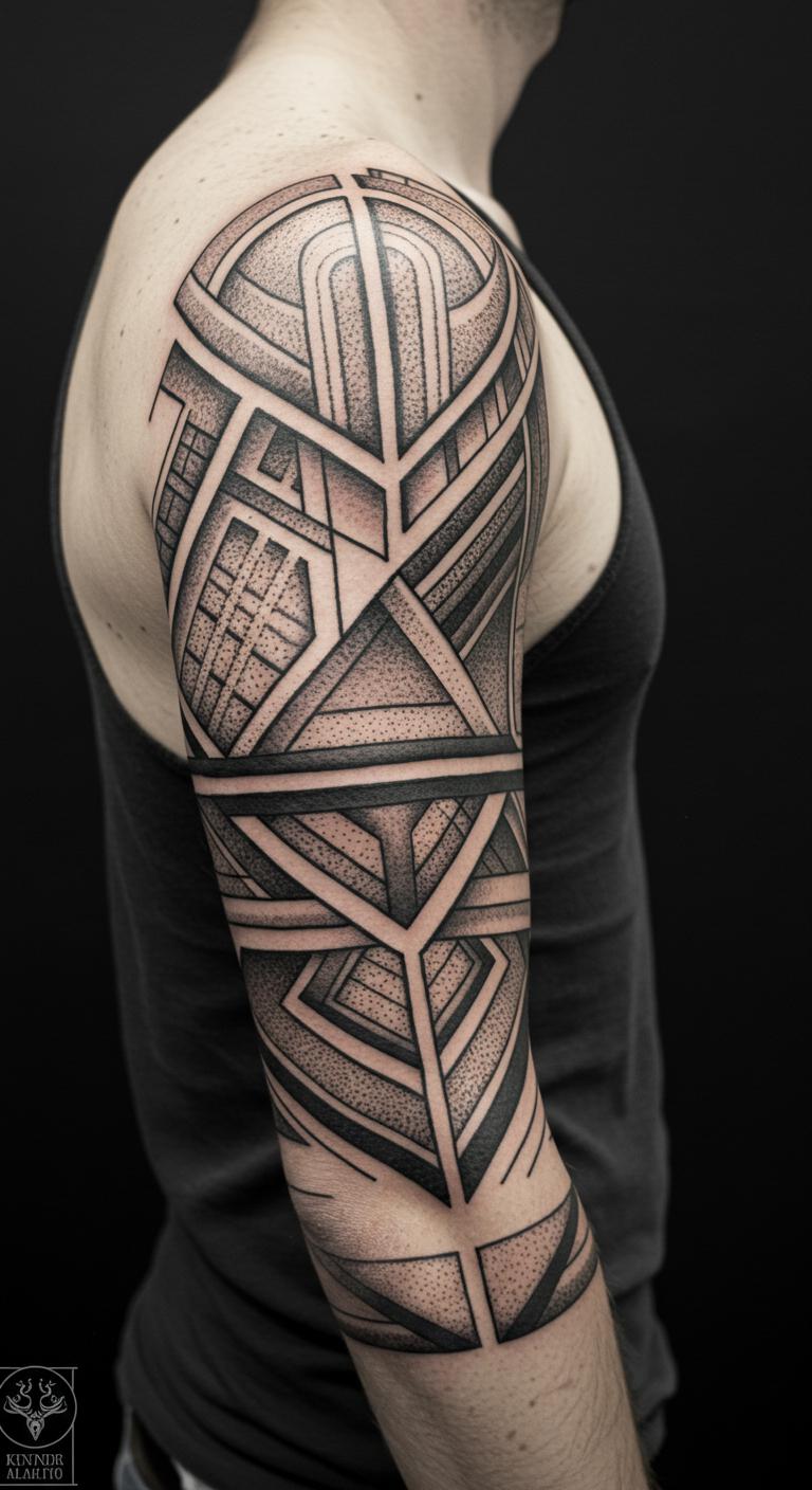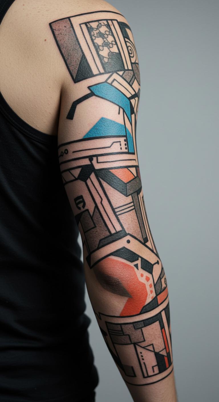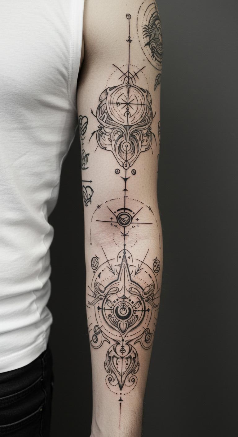 Think about starting with shapes like triangles and circles for a clean, bold effect. This sleeve uses simple lines to build a modern pattern. Grab a sketchbook and draw basic forms to plan your design. It costs less if you visit a local artist during off-peak times. Try tracing online templates at home for a DIY mock-up. Keep lines straight for impact. Use a fine-tip pen to practice on paper first. This approach saves money and lets you tweak ideas. Bold outlines make it pop over time. Add small dots for extra detail without complexity. Focus on symmetry to tie it together. You might find an affordable session by checking community events. Experiment with phone apps to visualize it on your arm.