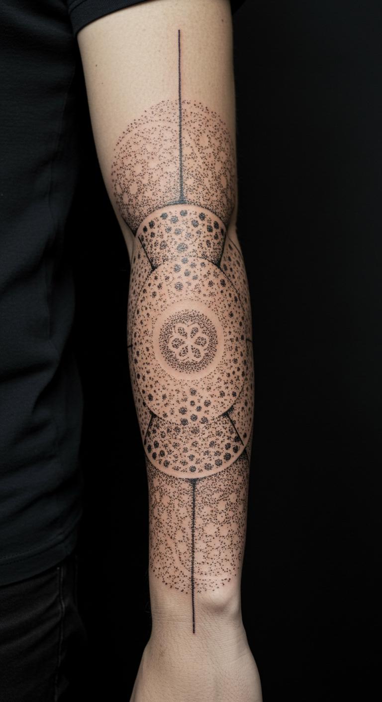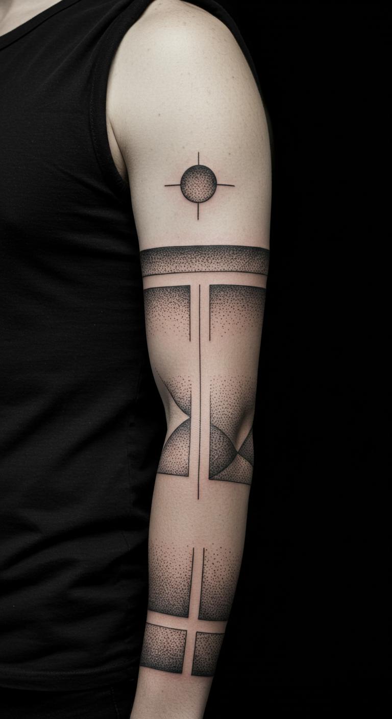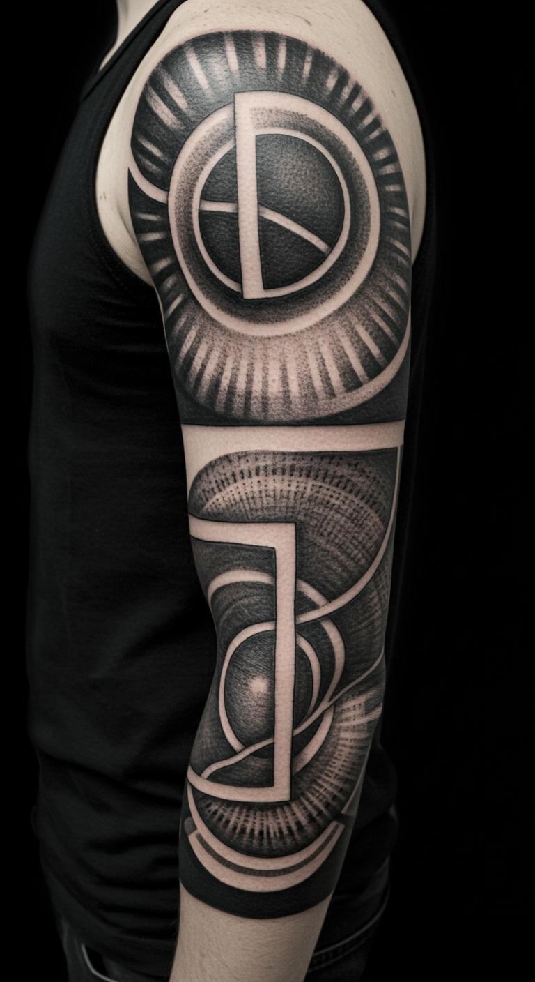 Think about starting with shapes like triangles and circles for a clean, bold effect. This sleeve uses simple lines to build a modern pattern. Grab a sketchbook and draw basic forms to plan your design. It costs less if you visit a local artist during off-peak times. Try tracing online templates at home for a DIY mock-up. Keep lines straight for impact. Use a fine-tip pen to practice on paper first. This approach saves money and lets you tweak ideas. Bold outlines make it pop over time. Add small dots for extra detail without complexity. Focus on symmetry to tie it together. You might find an affordable session by checking community events. Experiment with phone apps to visualize it on your arm.