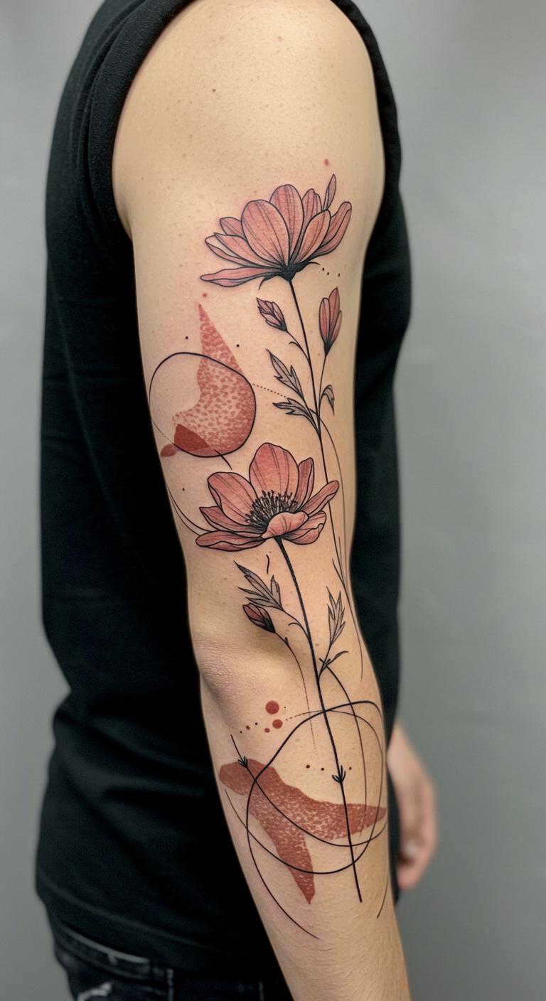 Flowers in a minimalist way add a touch of nature with just a few lines. Pick simple stems and petals for an easy sleeve. Draw basic flower shapes on paper to get started at no extra cost. Look for free online guides to sketch your own version. This keeps things budget-friendly. Choose spots that follow your arm’s curve for better flow. Use a marker to test designs on your skin before committing. It helps avoid mistakes. Opt for a local shop with deals to cut expenses. Add one flower at a time for a gradual build. Keep the style light to maintain that bold edge. Practice with household items like stencils. This method lets you create without spending much.