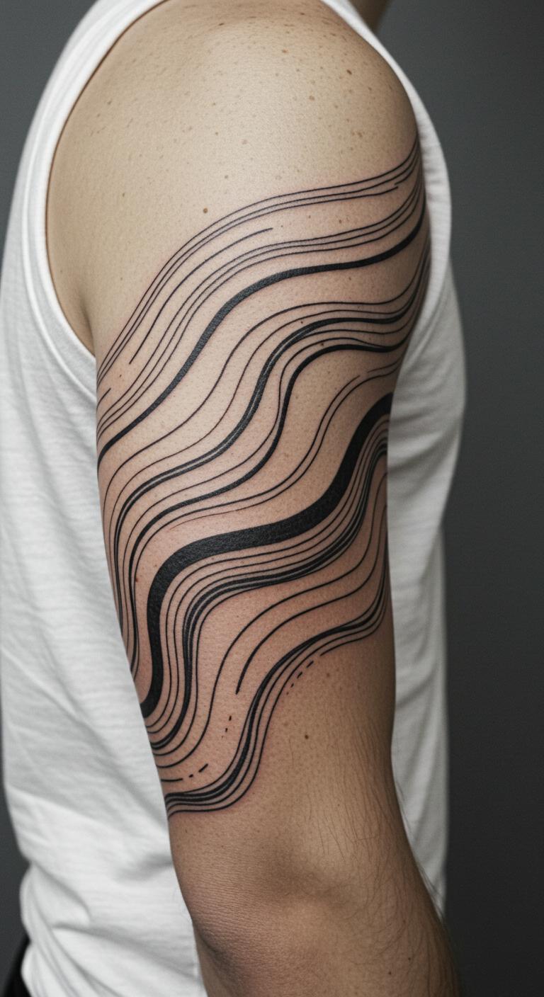 Wavy lines create an abstract flow that feels dynamic yet simple. Start with freehand sketches to plan. Draw looping lines on paper for practice. It doesn’t cost anything extra. Adapt the design to your arm’s shape for comfort. Use a string at home to mimic curves on your skin. This DIY trick helps visualize. Look for affordable artists in your area. Keep lines bold to ensure longevity. Add a few curves at a time. Experiment with different widths using markers. Focus on rhythm to make it cohesive. This way, you can customize without big expenses.