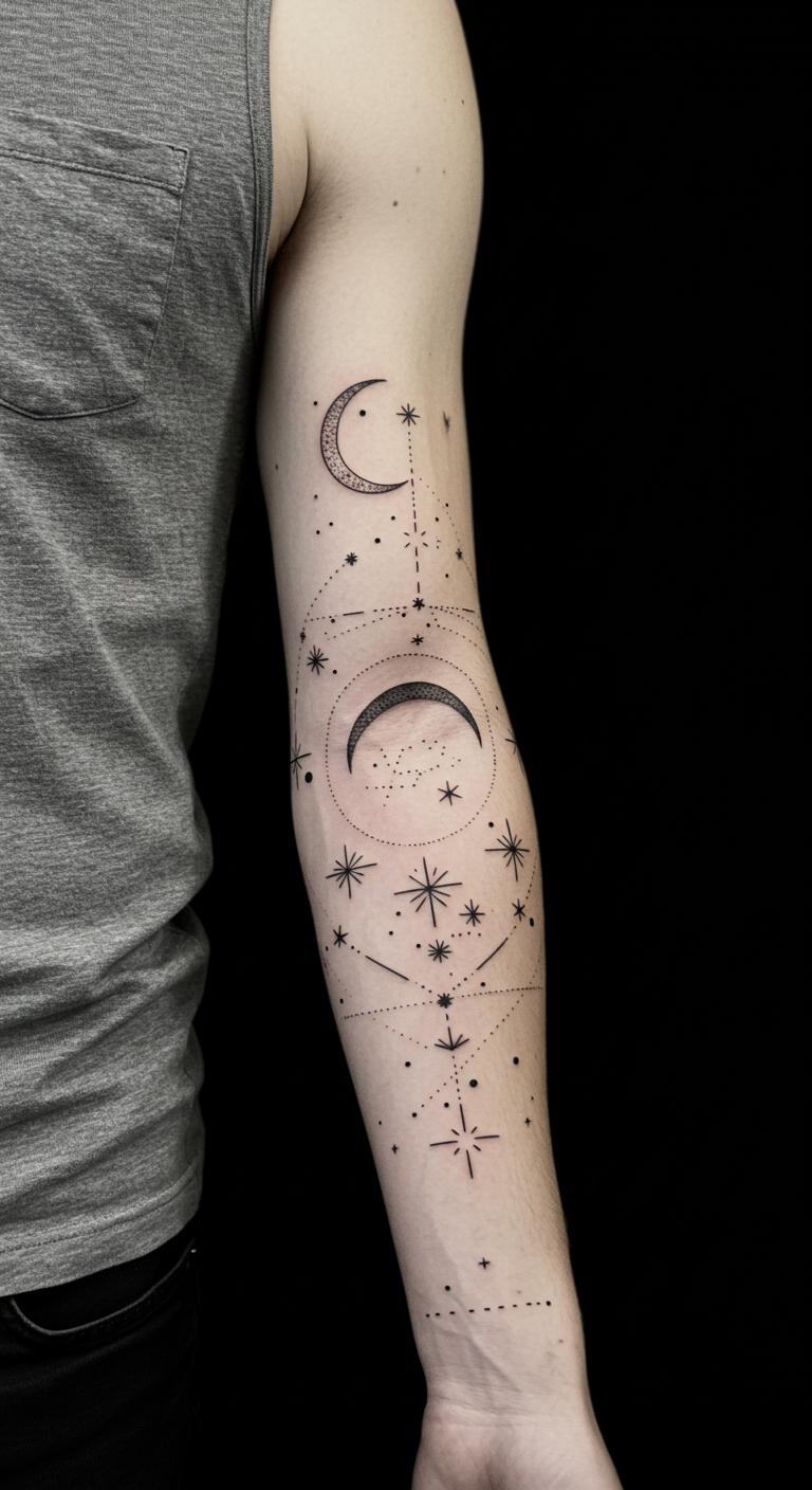 Stars and moons provide a cosmic touch with minimal effort. Sketch basic shapes on paper to begin. Use free templates from the web for ideas. No need for fancy tools. Arrange them along your arm for balance. Draw with everyday markers to preview. It helps plan affordably. Check for deals at nearby tattoo places. Keep designs sparse for boldness. Add one element per session. Try string art at home for inspiration.