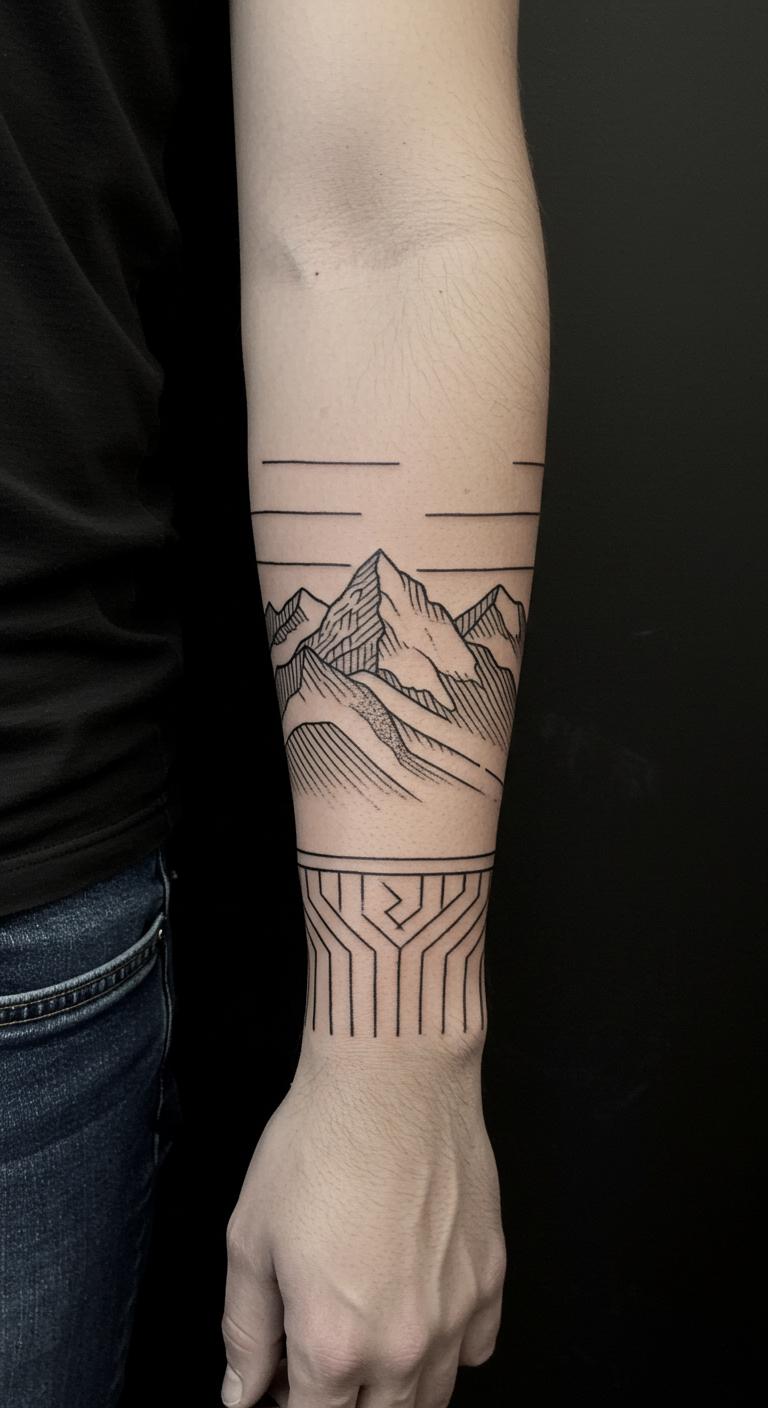 Peaks in lines make a rugged sleeve. Sketch triangles on paper. Trace from nature pics online. No extra cost. Follow arm shape. Draw with markers first. Check for cheap sessions.