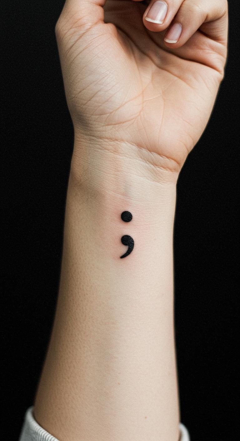 A semicolon marks your story. It pauses but continues. Go for the punctuation. Stick to black. Draw it simply. This could be $40. Care with basics. Use semicolon stickers. This sign fosters confidence through persistence. Place visibly. Discuss meaning. You’ll continue strong.