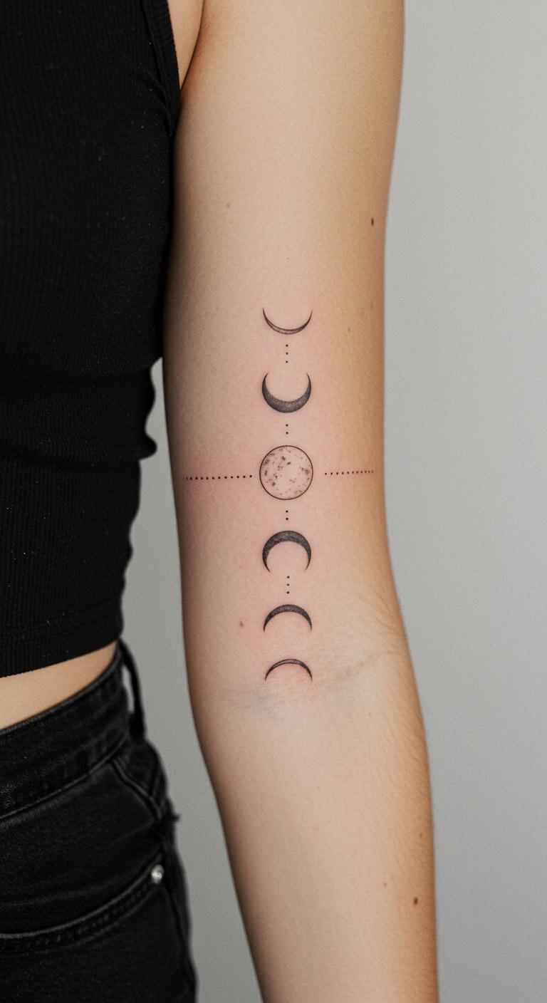 Moon phases on your arm tell a story of change. Imagine a row of simple curves from new to full moon. This layout flows with your body’s shape. Draw phases on your skin with a washable marker before deciding. For DIY fun, use temporary tattoos from online shops; they cost pennies and last a week. Apply them with water and a cloth at home. Break it down: pick three phases to start. Choose spots that flex less for better results. Professional ink might run $50 to $150, depending on size. It’s easy to maintain with regular moisturizing. Pair it with a nature theme for extra flair. This idea works for tracking personal growth.